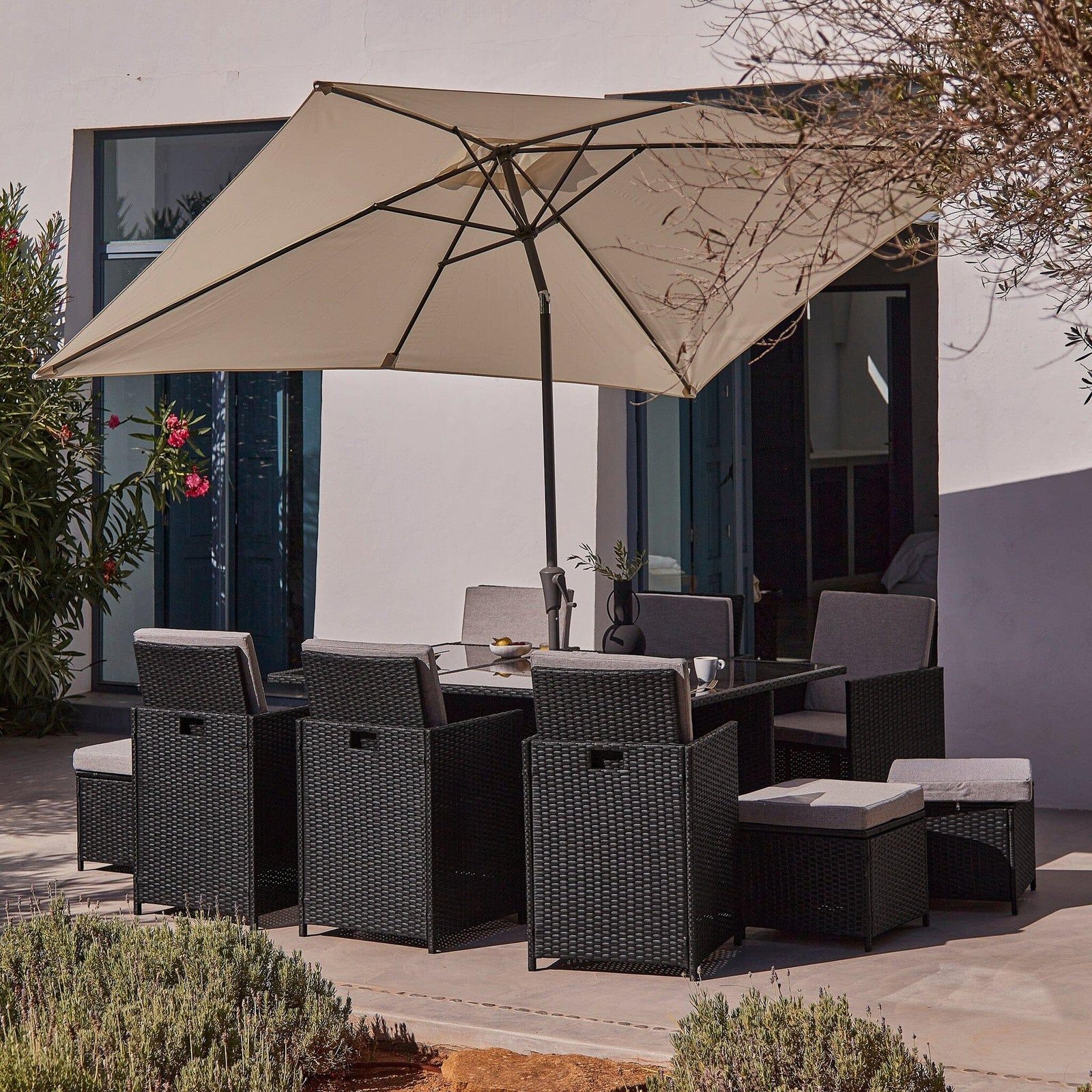 - Set includes – 6 rattan dining chairs with cushions, 4 rattan stools with cushions, glass dining table, cream LED parasol and parasol rain cover.