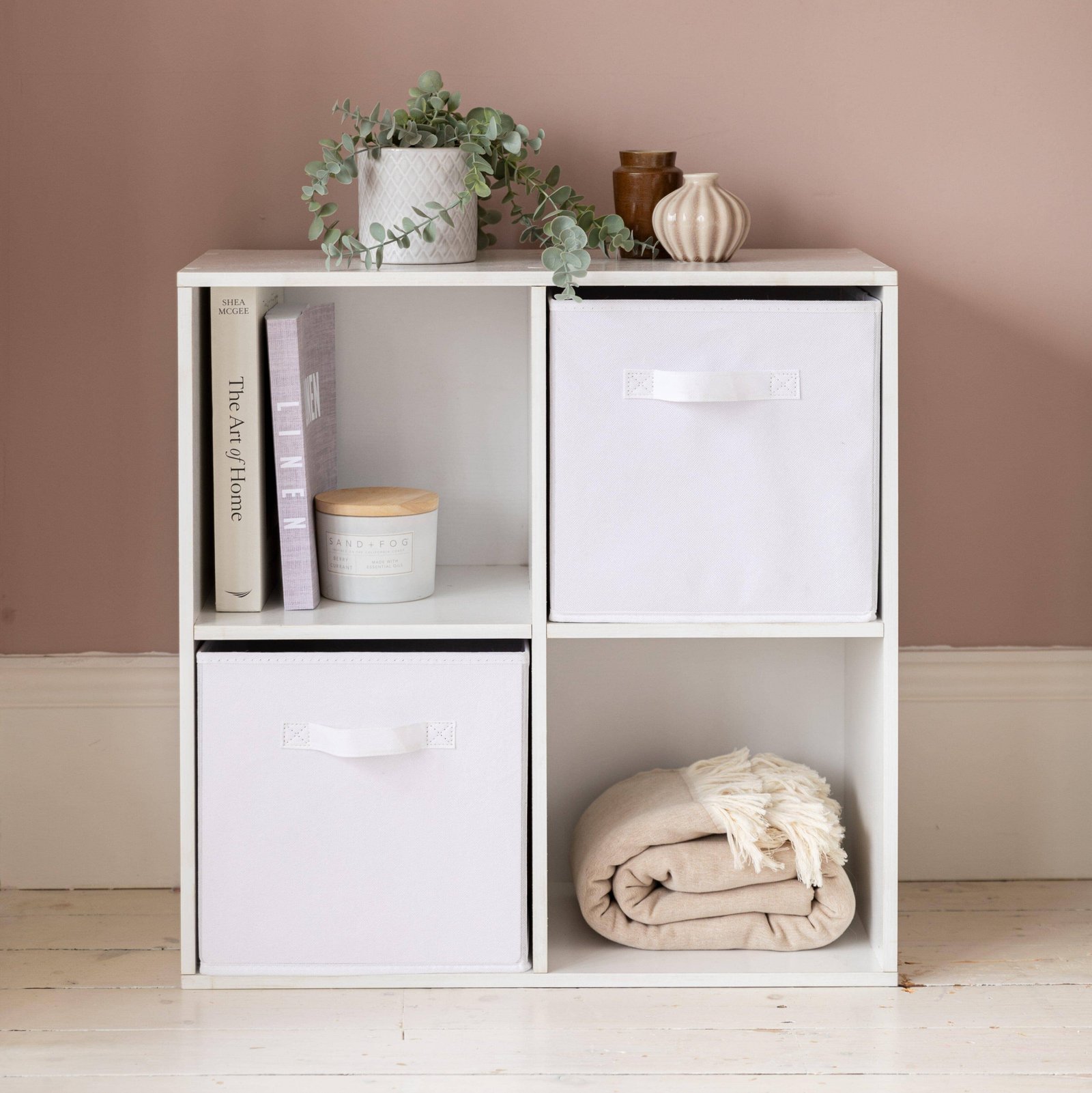 Cara 4 Cube Chalk White Bookcase Wooden Display Unit Shelving Storage Bookshelf Shelves – White Basket