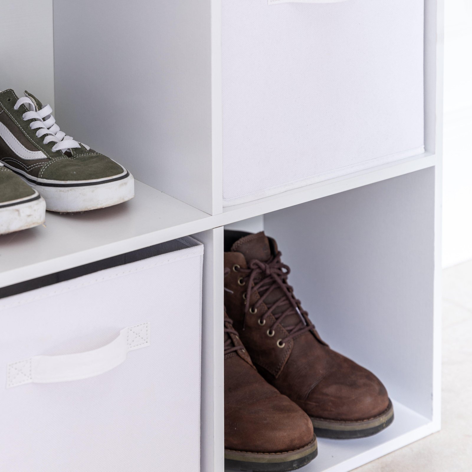 - Set Includes – 1 x 6 cube storage unit & 3 x white storage boxes.