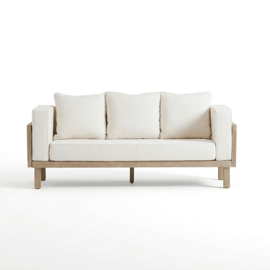 Create an elevated outdoor living space with the Akira 8 seater wooden garden sofa set. Ideal for spacious gardens, the set features two Akira generous 3-seater sofas and two Akira armchairs, each designed with a solid acacia wood chunky frame and elegant neutral linen look cushions for comfort. This 8 seater set is complete with the matching Akira coffee table with raised edge and classic cross over leg design, plus two Akira side tables with the same design made from light brushed acacia wood.