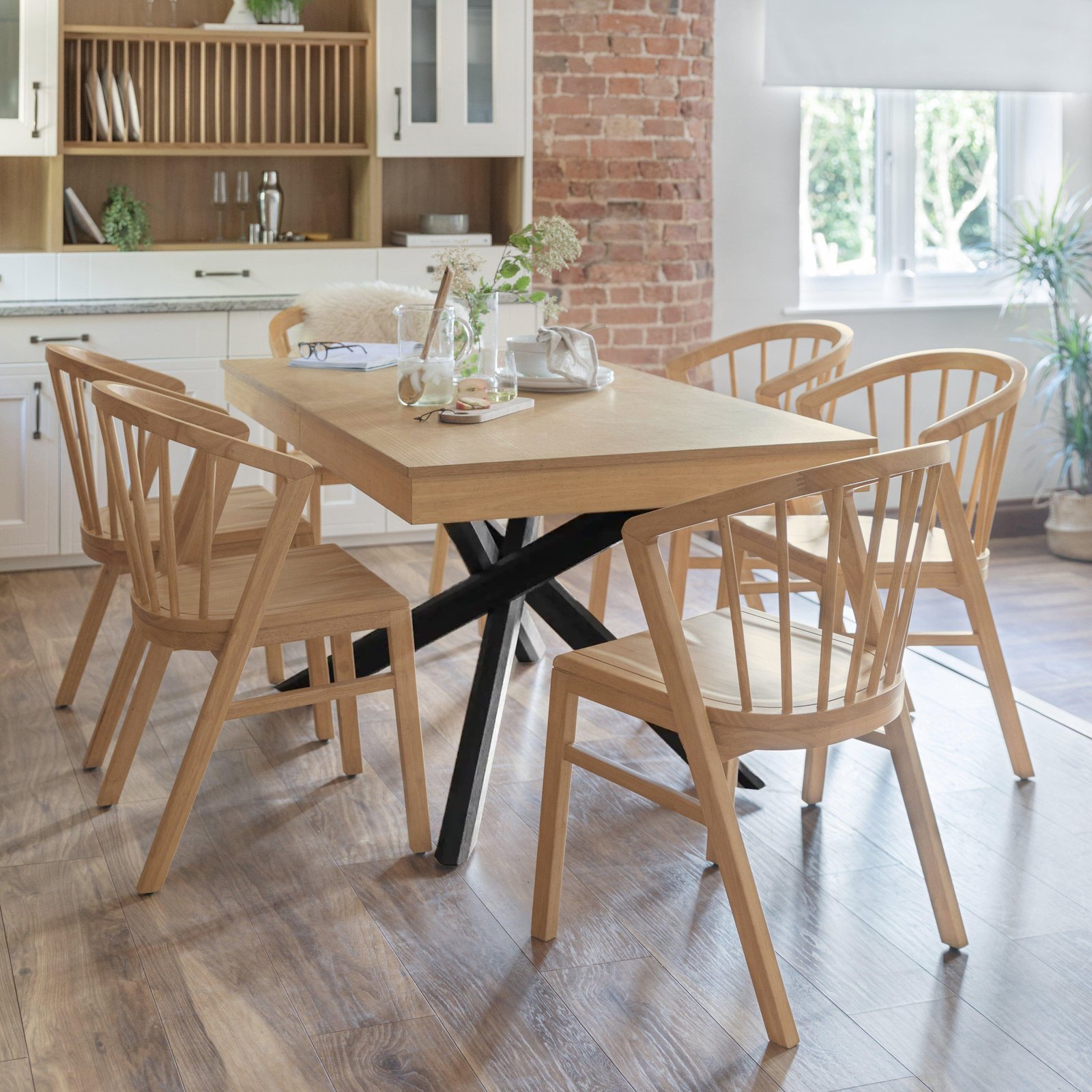- Design features – Rectangular table in pale oak with intricate sculptural black leg design and extending function.