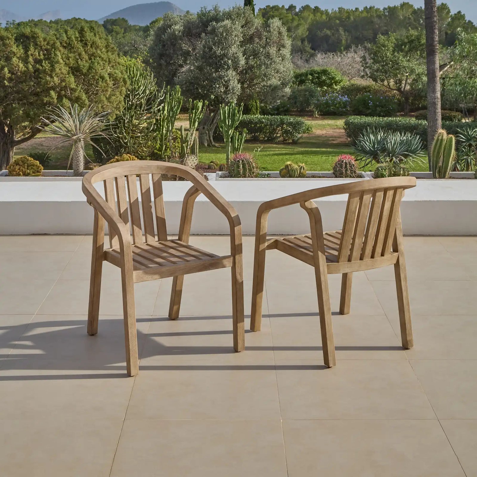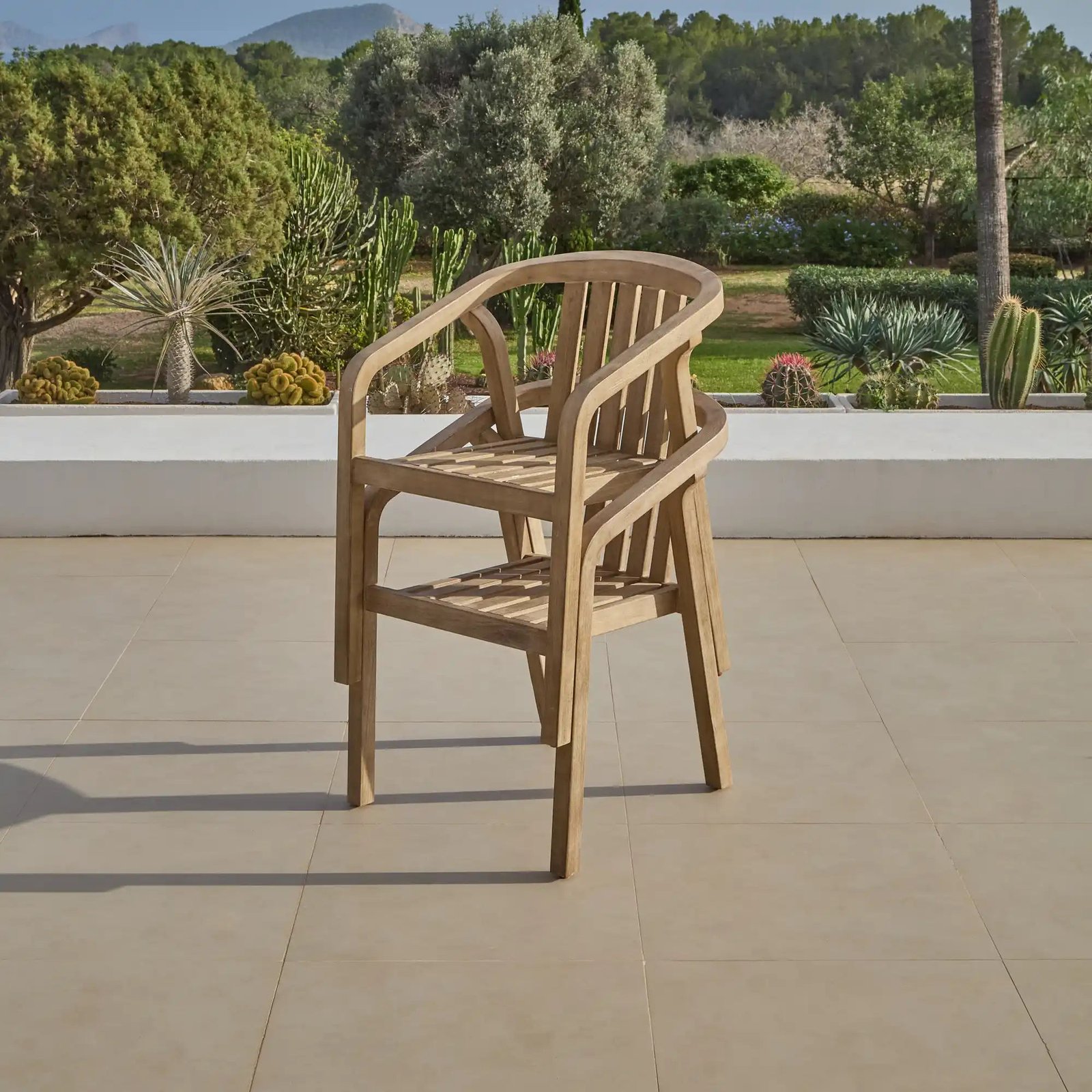Crafted from brushed light acacia wood known for its strength and durability the Amelia and Shiro dining set is perfect for outdoor entertaining. The dining table features a rectangular slatted tabletop and entwined legs for a sculptural look. The table comes with 6 Shiro chairs designed in light brushed acacia wood to match the table and features a curved back and arms for support.