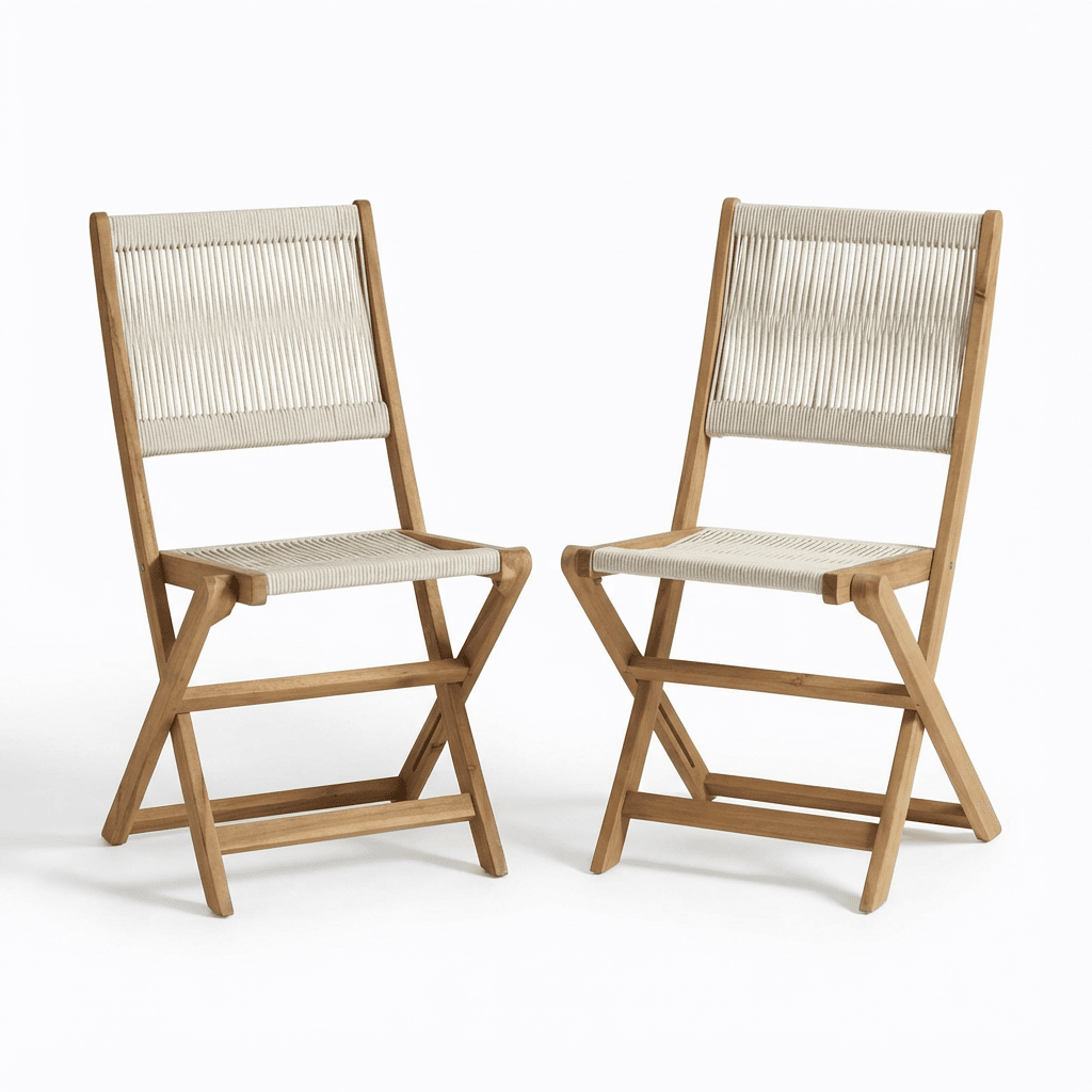 - Chair Design Features – Folding chairs with wooden frame and beige rope seat and back support.