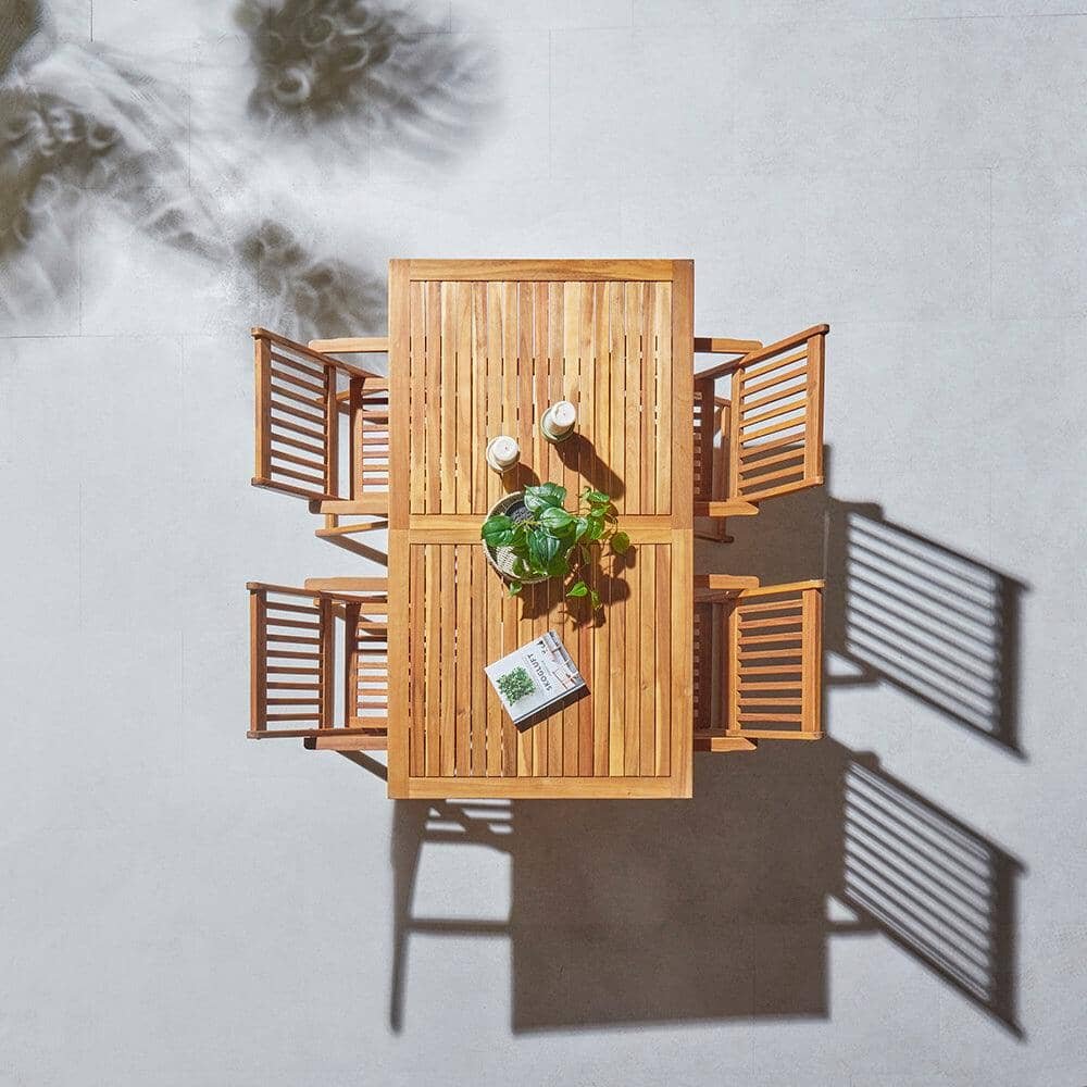 The Ashby 4-Seater wooden rectangular garden dining set is a timeless outdoor furniture set featuring a classic rectangular dining table, crafted from the inviting warmth of acacia wood and complemented by four folding outdoor dining chairs. This dining set also includes a practical premium parasol in grey with LED lights nestled in the canopy, providing luxurious shade and shelter that can be enjoyed late into the sunset.