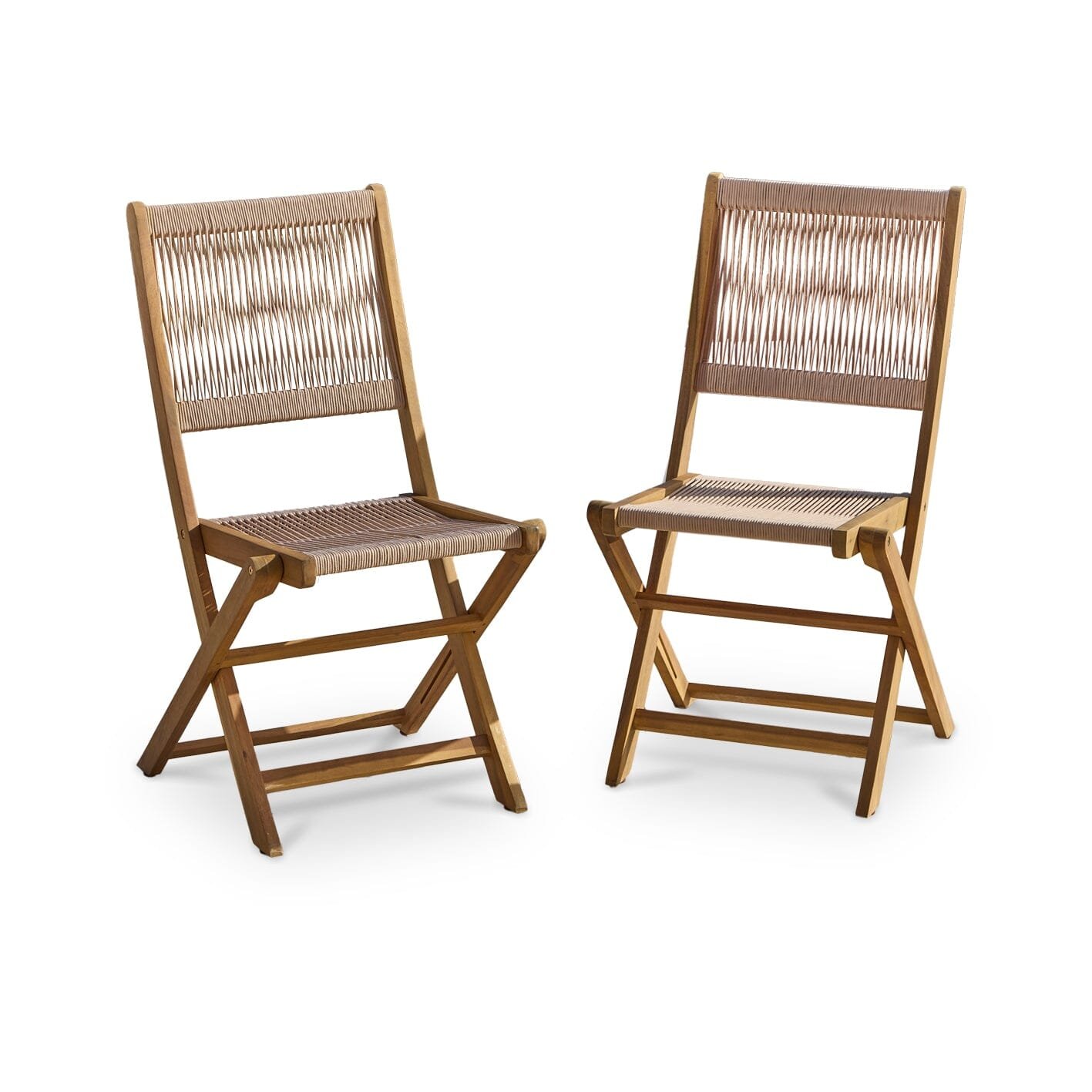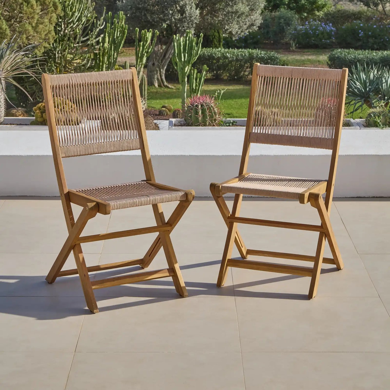 - Chair design features – Folding chairs with wooden frame and rope seat and back support.