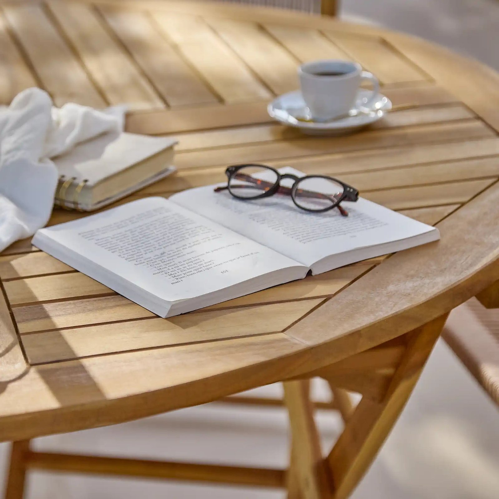 - Set includes – Ashby round 130cm wooden garden dining table with 6 Cove dining chairs, grey parasol and parasol base.