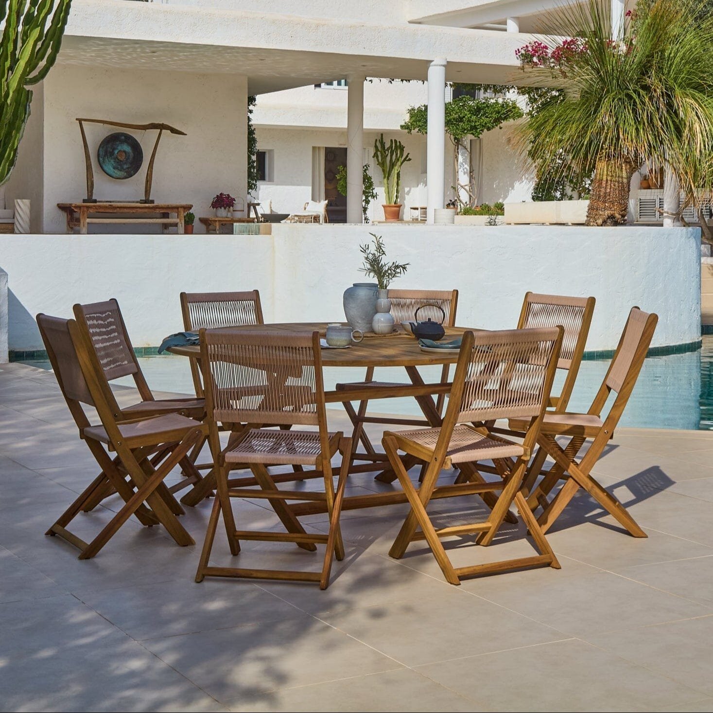 Elevate your outdoor dining space with the Ashby 8-seater round wooden dining set. The Ashby table is crafted from natural acacia wood and features a handy folding mechanism. The table comes with 8 beautiful Cove dining chairs each featuring an acacia wood frame and rope seat and back support.