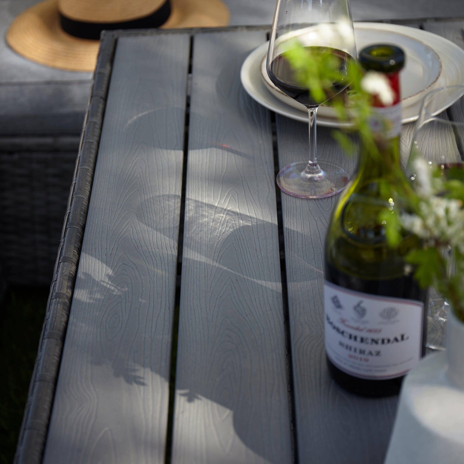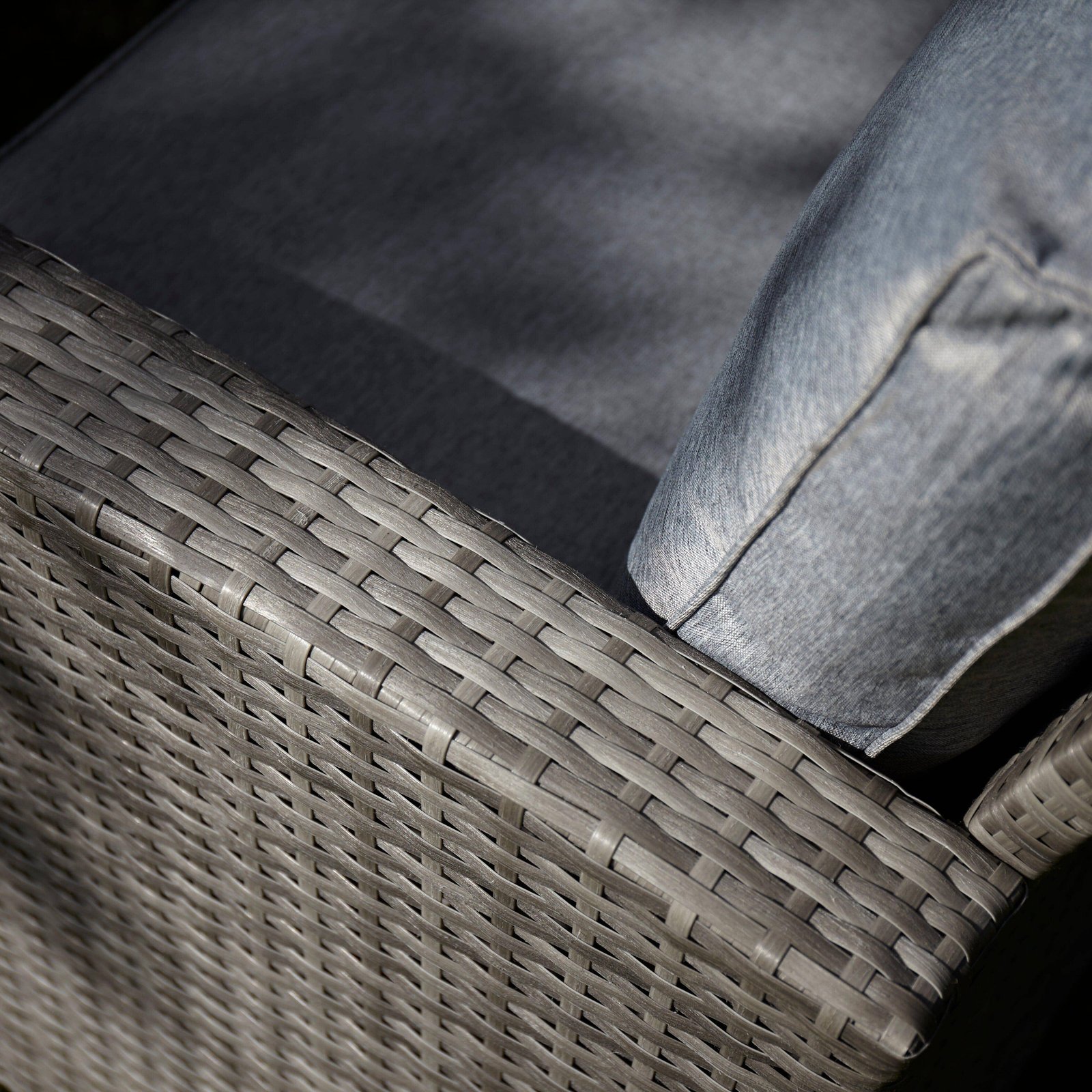 - Finish/material – Grey PE rattan with polywood tabletop.