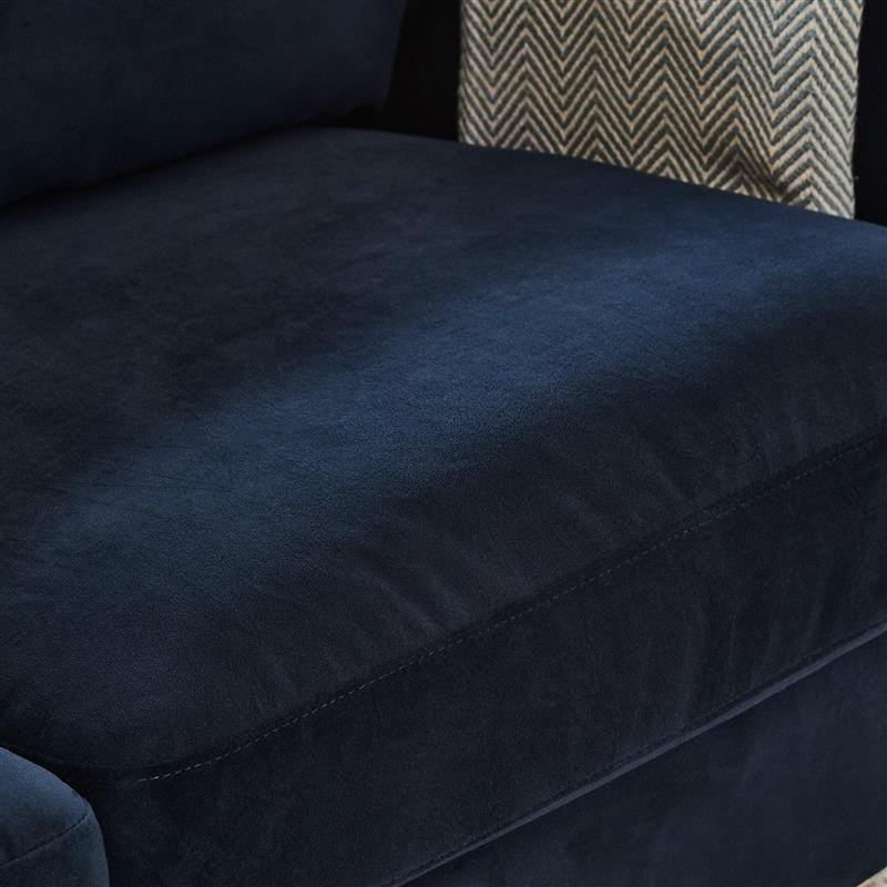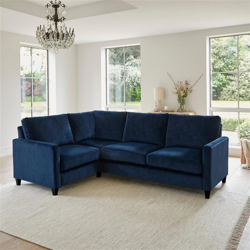 Elevate your living room with the Ava right L shape corner sofa. Upholstered in velvet with a chic ink blue hue the large Ava corner sofa features black oak legs, deep comfy seats and a low back. The Ava sofa will add a modern and stylish look to any living space.