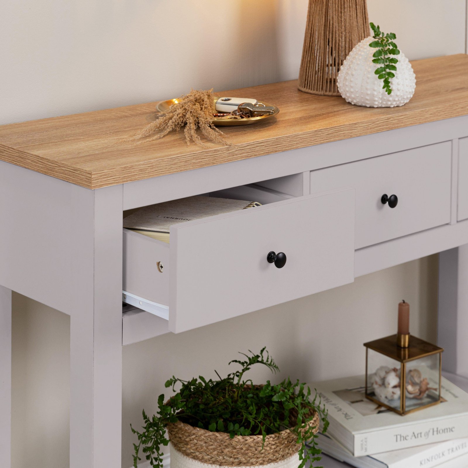 - Set Includes – 1 x Bampton 3 drawer console table in stone grey.