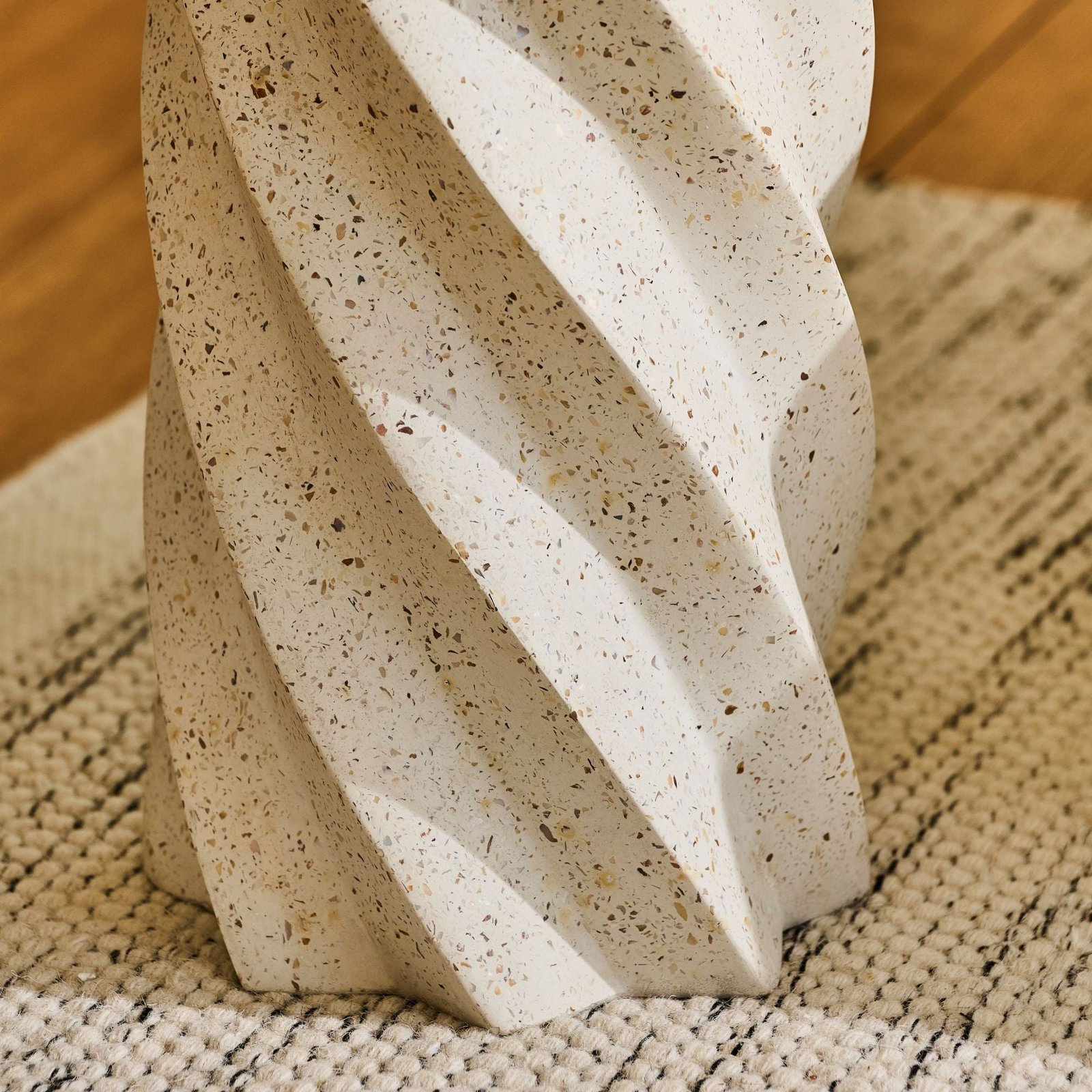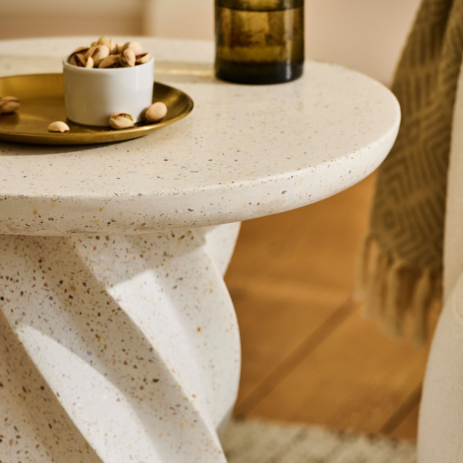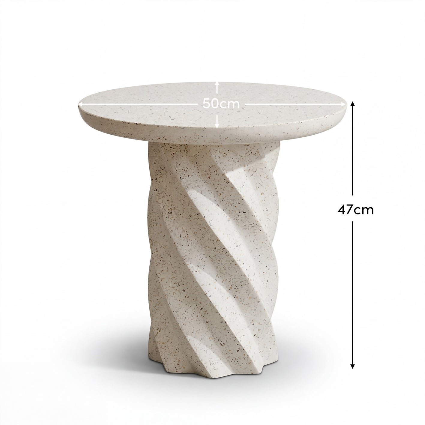 - Design Features – Unique twist design round side table in concrete and paprika terrazzo.