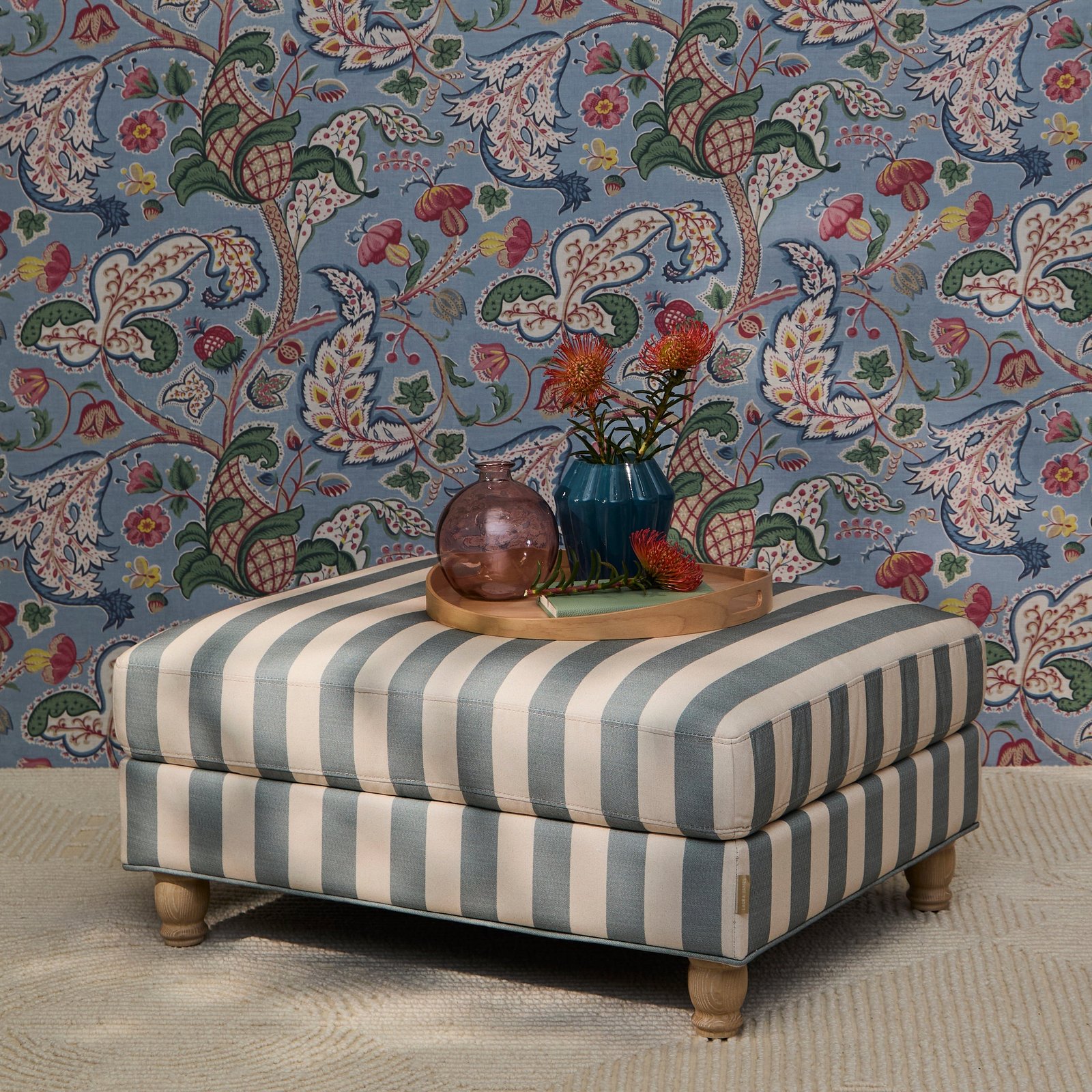 - Design features – Brea footstool in blue stripe with plump cushion and whitewash legs.