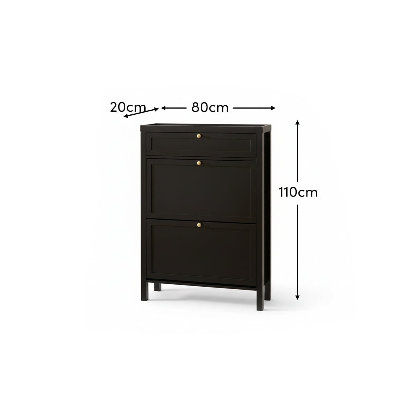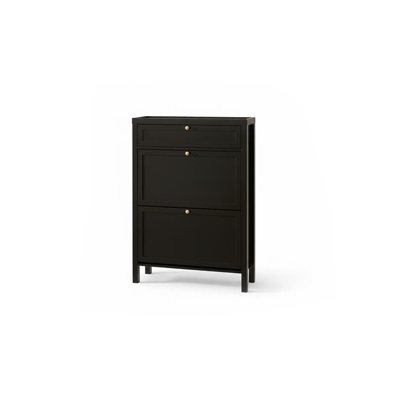 - Design features – Black 2 door shoe cabinet with shaker style doors and gold handles and one drawer.