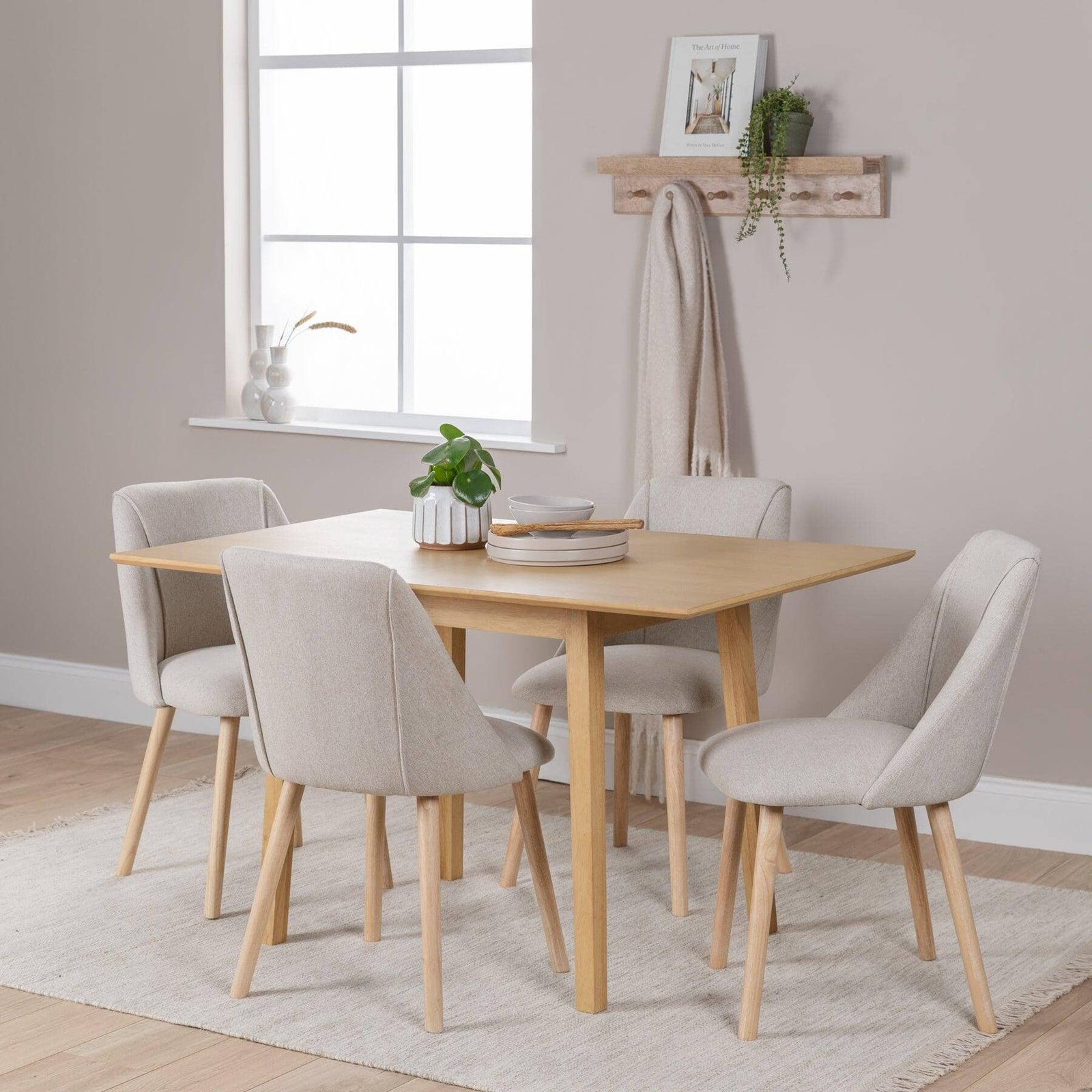 The Charlie extending dining table comes in pale oak veneer, and seats 4 people without the extension and seats 6 people when extended. Combining simple contemporary style with practicality makes this table is a versatile choice for your dining space. It’s compact design makes it ideal for everyday living, yet it can quickly be transformed into a 6 seater table with its easy swivel extension function.