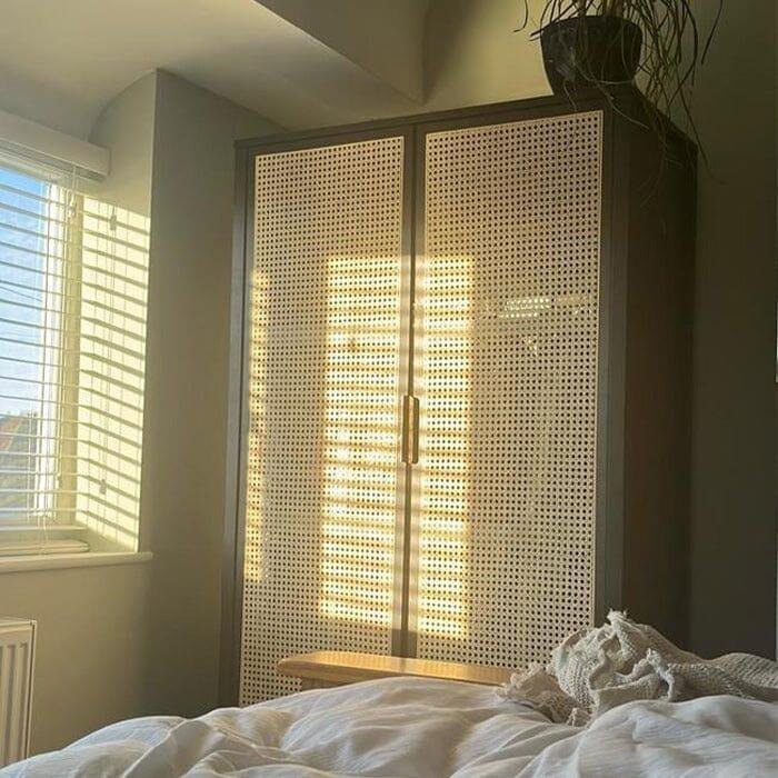 Keep your clothes organised with the Charlie wardrobe in black. This boho inspired small wardrobe offers a casual feel with two cane front doors. The rattan detailing pairs perfectly with the dark finish of this wardrobe and is completed with brass handles for a retro edge.