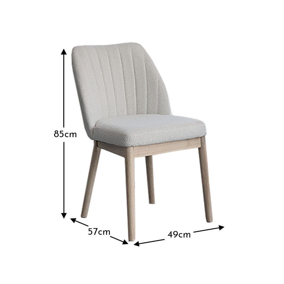 The Chloe set of 2 dining chairs feature light beige boucle upholstery and whitewash solid rubberwood legs. The chairs boast elegant curved backs with fluted stitching for style and comfort, while the wooden frame and inset legs create a strong, contemporary contrast, a perfect match to the Amelia whitewash dining table
