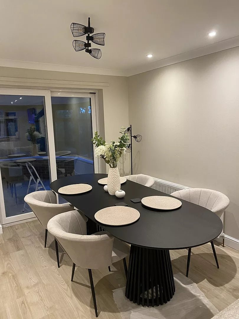 The Cleo dining chairs, upholstered in a soft beige hue made from velvet with black steel legs, offers an elegant, art-deco-inspired seating solution. Their plush, neutral design enhances any dining space, making these chairs perfect for both formal dinners and casual meals.