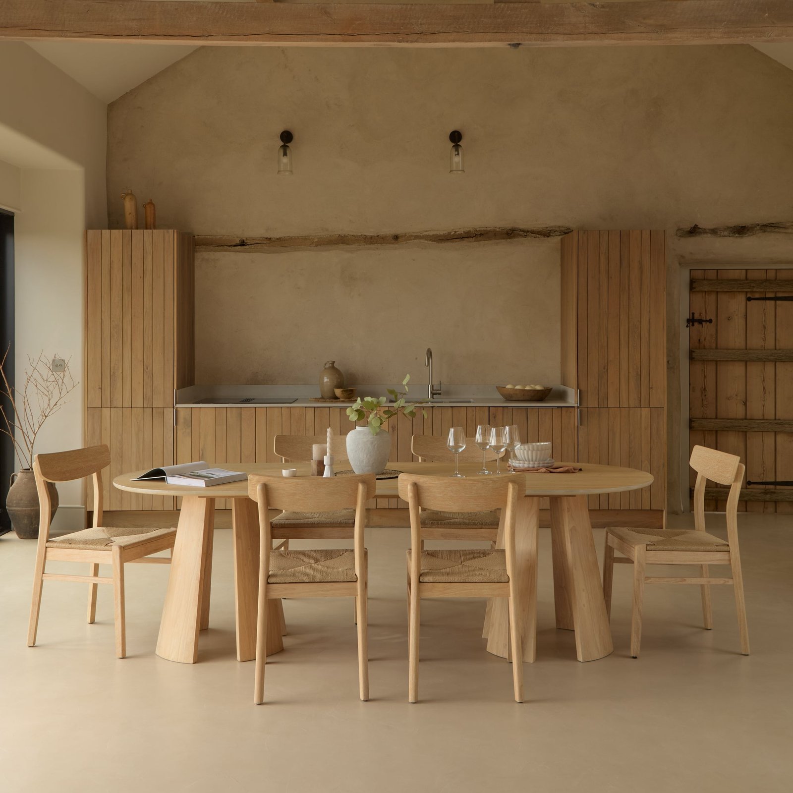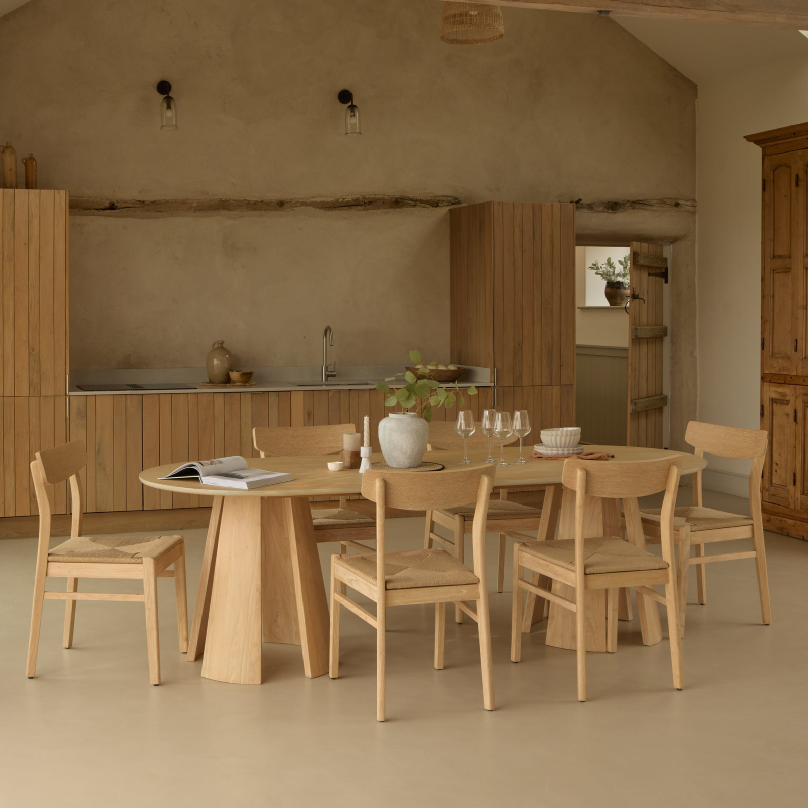 Create a focal point in your dining room this season with this truly statement dining set. The Farren oval dining table is new for AW25 and features striking slatted table legs at either end of the oval shaped table with a chamfered edge and whitewash finish. The table comes with six Faye dining chairs each with a woven seat for comfort and whitewash finish.