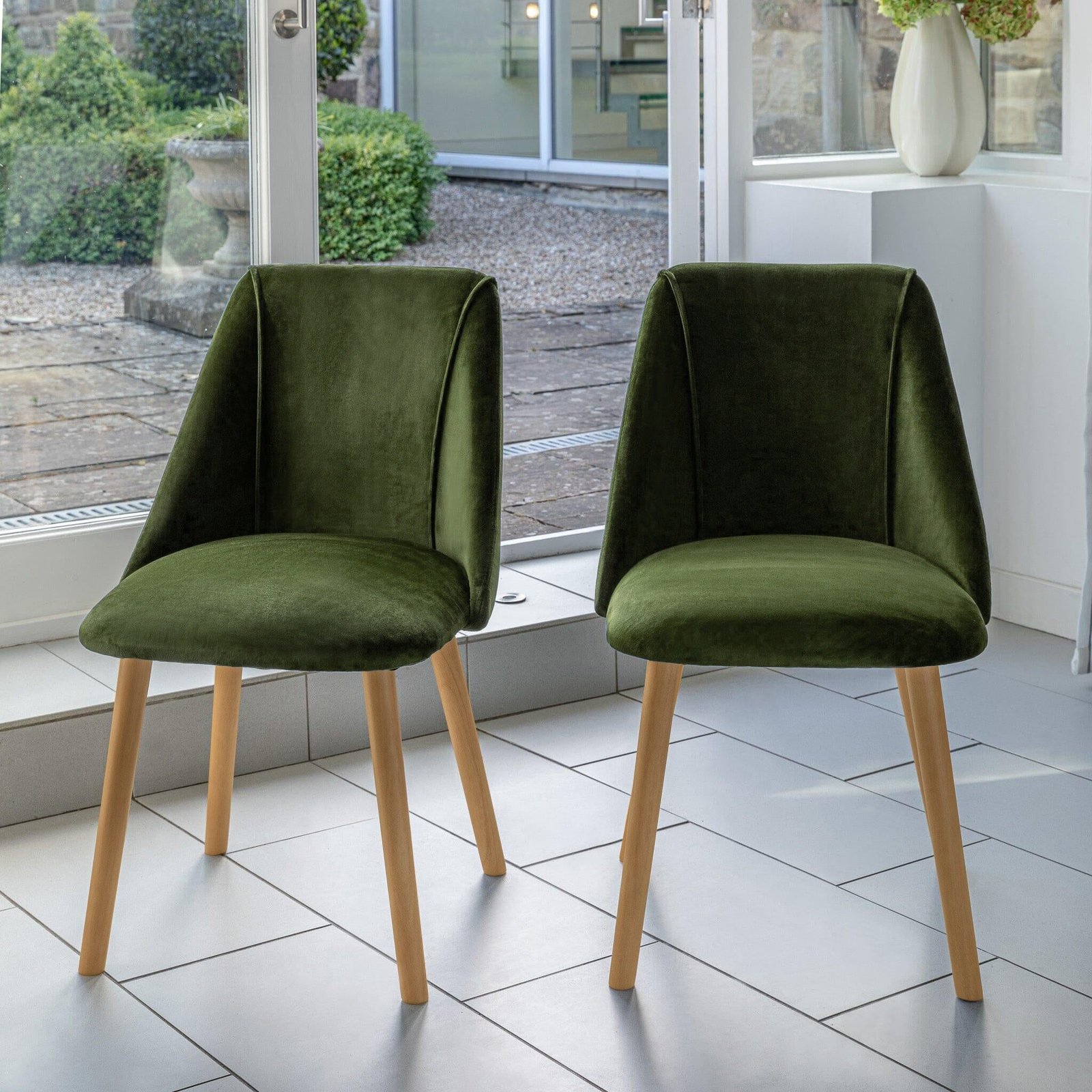 - Set includes – 2 x Freya dining chairs in green velvet with pale oak legs.