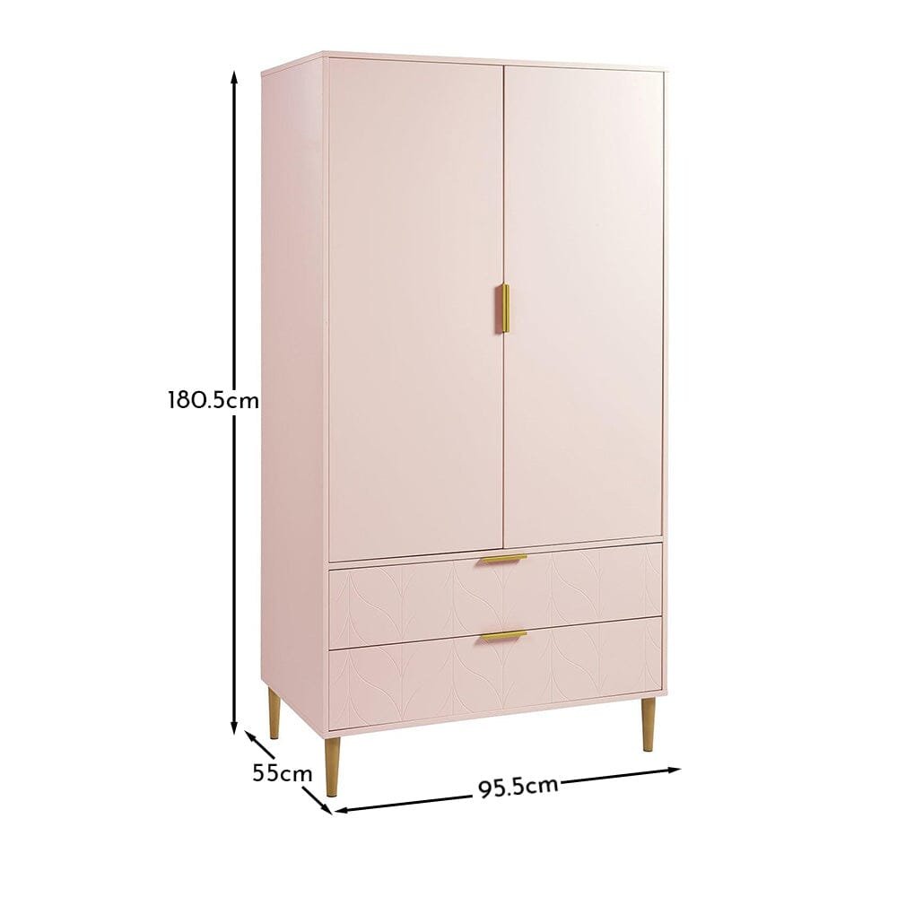 Give your bedroom a refresh with this double wardrobe. Combining effortlessly elegant style with innovative storage solutions, Gloria will help you transform your bedroom into a serene space. Styled in a blush pink, with brass effect hardware and legs and intricate carved drawer fronts, this wardrobe is the ideal piece for injecting a touch of art deco style into your bedroom.