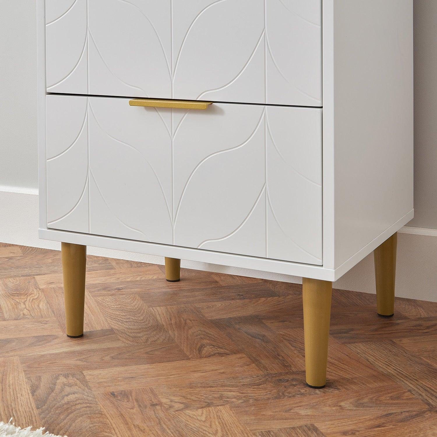 Gloria has a sleek appeal that’s been created with brass effect handles and legs as well as intricate carved detailing on every drawer front. This romantic style makes for a chic bedroom style that looks at home when paired with any décor.