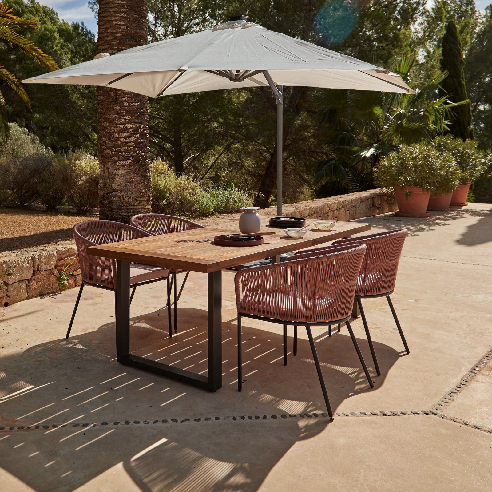 The Hali garden dining set features 4 pink rope designed garden dining chairs and a 175cm solid wood outdoor dining table with steel legs. This Hali 4-seater garden dining set is made to be enjoyed all summer long by friend’s and family over delightful dinners in the sun. This outdoor dining set comes complete with a cream premium cantilever parasol.