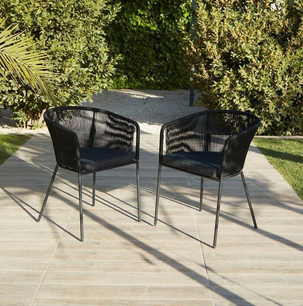 The Hali garden dining set is a stunning statement piece sure to impress. The rugged, industrial-style table is perfectly complemented by the intricate details of the Hali black rope garden chairs, creating the perfect alfresco dining set.