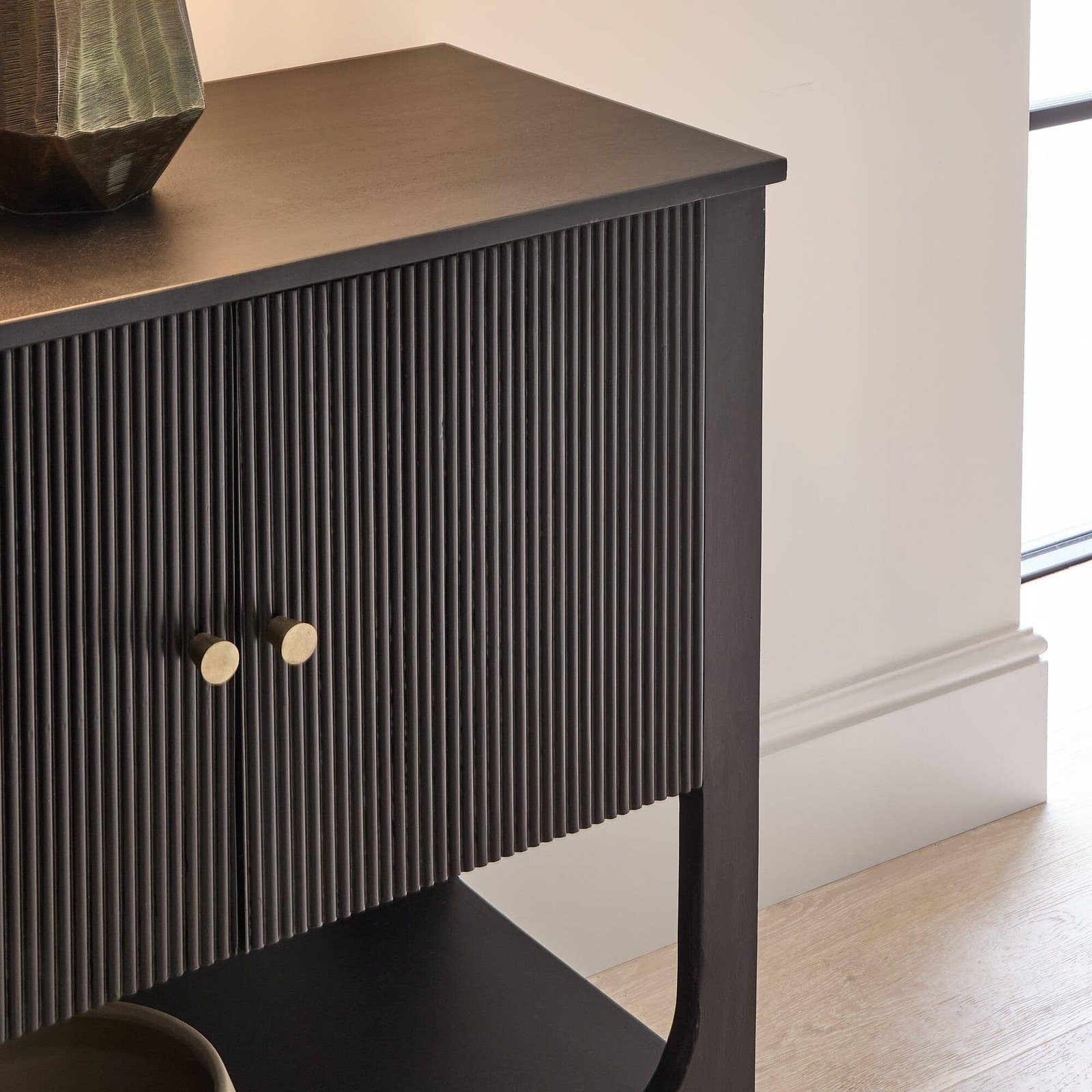 • Design FeaturesJet black fluted wooden doors with gold handles.