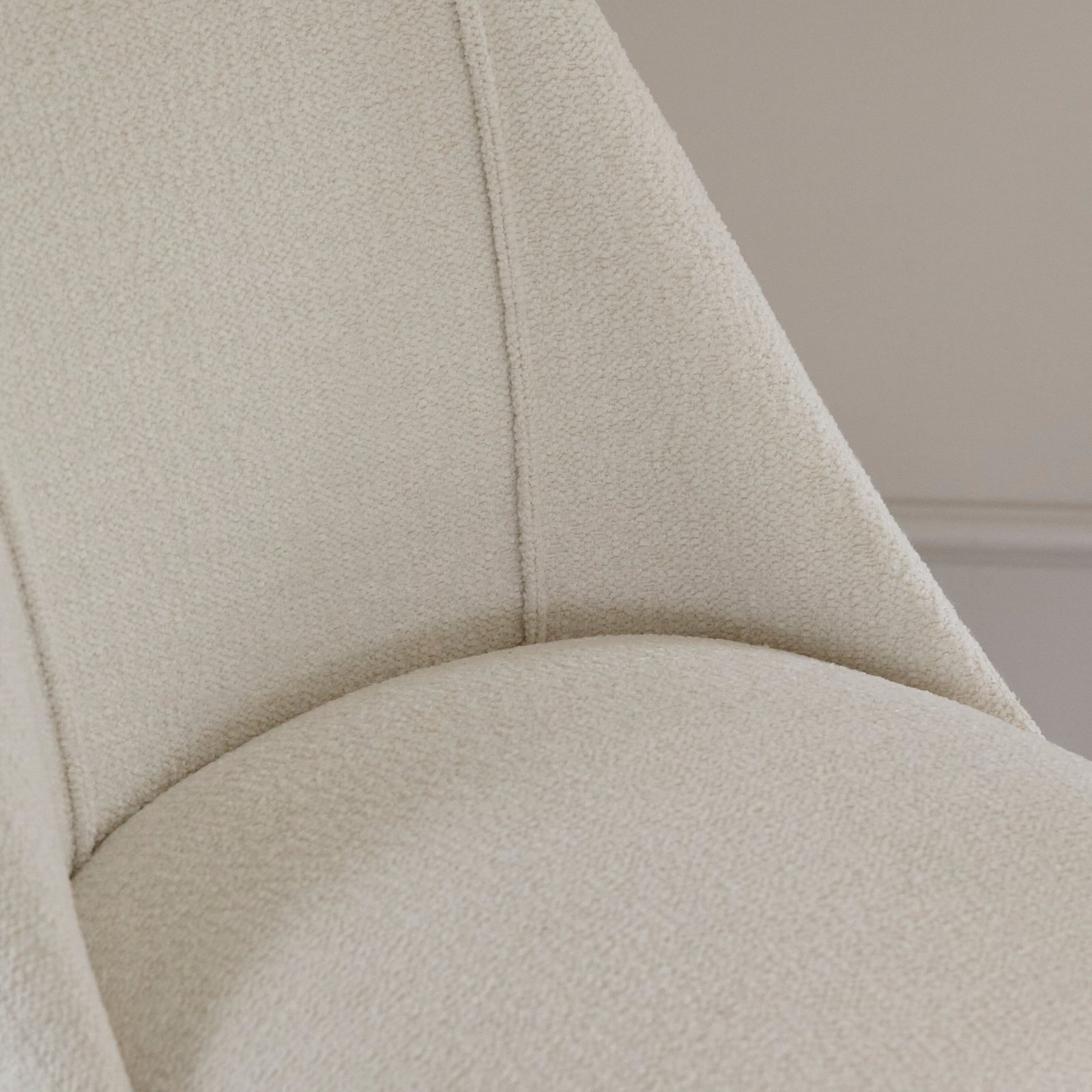 - Chair Finish/Material – 100% Polyester ecru boucle fabric and rubberwood legs.