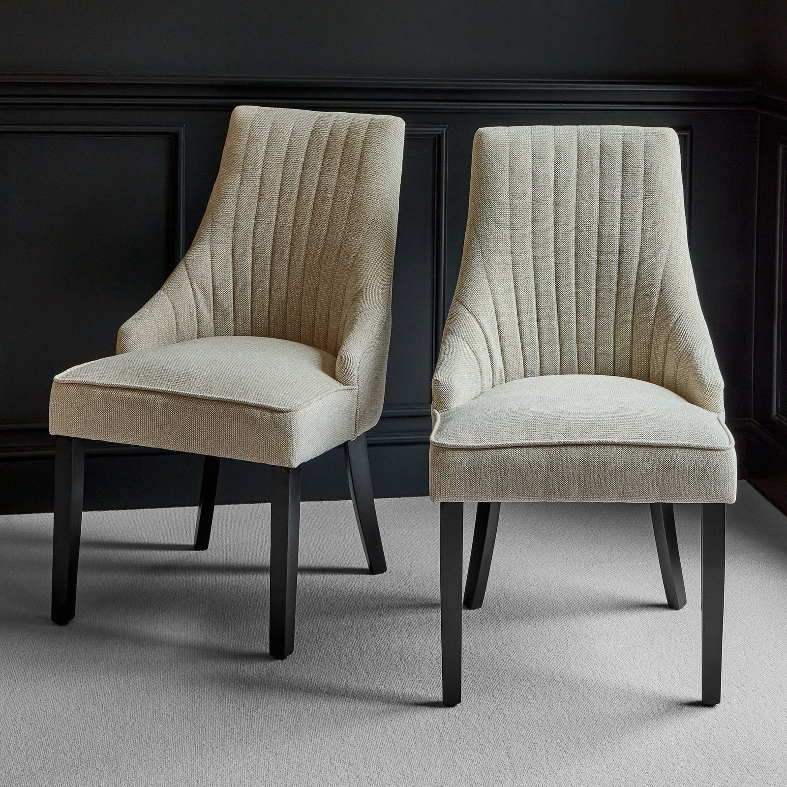 The Jade and Nadine dining set will instantly elevate your dining space. The jet-black Jade rectangular dining table is made from durable acacia wood and features a large oval cut out design in the base of the table. The set features 4 Nadine dining chairs with a fluted back and upholstered in a textured taupe fabric with black legs for a chic look.