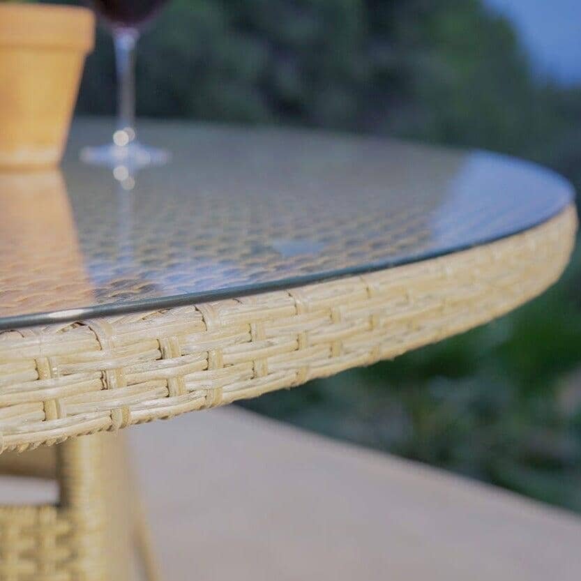 The Kemble natural brown rattan bistro set is a tasteful rattan furniture bijoux seating set, consisting of 2 stackable rattan armchairs that have natural seat cushions and a glass-topped table, perfect for outdoor dining or unwinding with refreshing beverages.