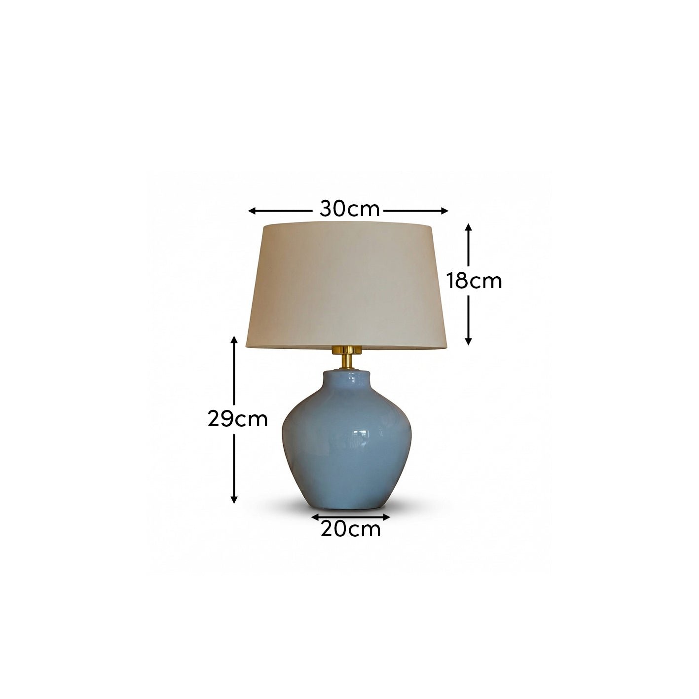 • Design features – 27cm ceramic lamp base in cornflower blue with gold bulb metal holder with 30cm white lampshade and 2.5m cable and in-line ON/OFF switch with an EU/UK convertible plug and requires an E27 bulb.