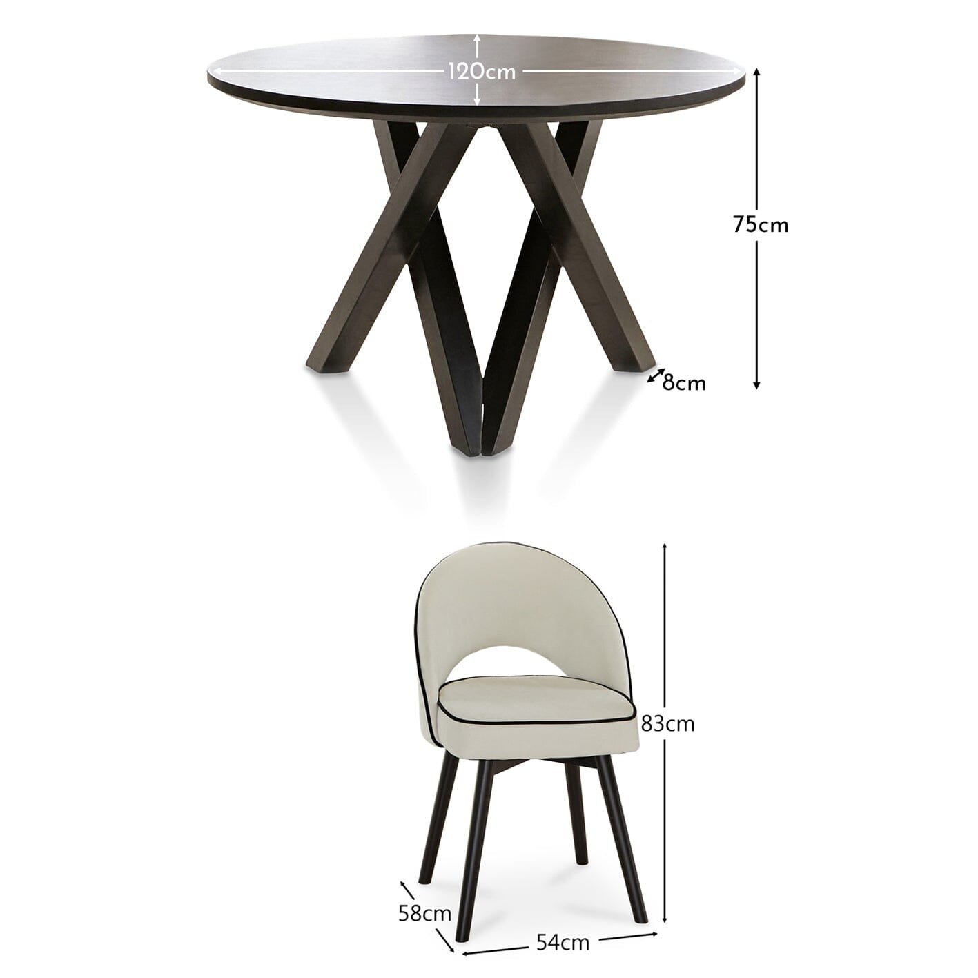 Create a stylish look in your home with the Levi and Marilyn dining set. Finished in jet black the Levi round table features solid acacia wood tabletop with chamfered edge and cross over metal legs. The Levi round dining table comes with 4 Marilyn dining chairs. Each Marilyn dining chair is upholstered in ivory fabric with black piping detail, cut out curved back and black legs.
