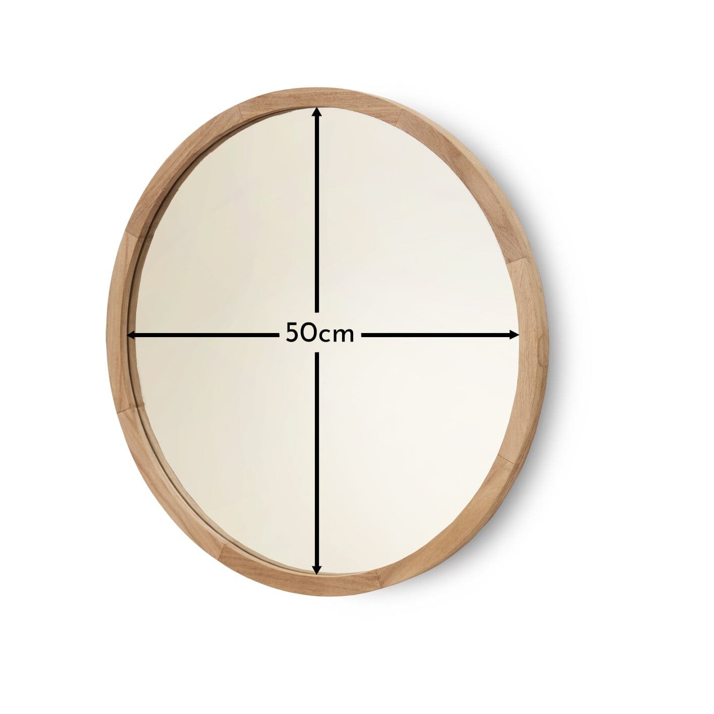 - Design features – Round shaped 50cm mirror with wooden frame.