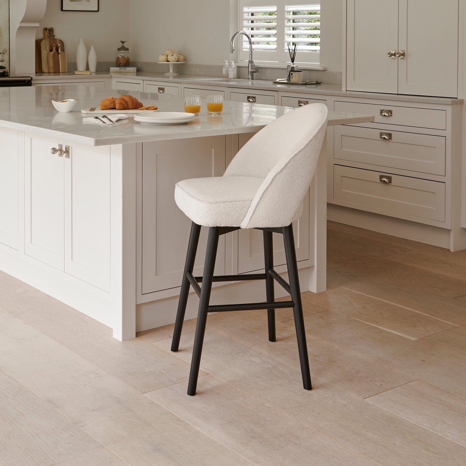 This ecru boucle barstool is modern and elegant in style, as well as offering practicality and comfort for chilled everyday breakfasts or drinks with friends. Marilyns textured boucle effect, contrasted with the black legs, creates a sophisticated look that effortlessly blends into any contemporary kitchen or bar setting.