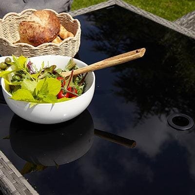 - What’s included – Marston rattan rectangular dining table with glass top & 4 rattan garden dining chairs with grey LED premium parasol, parasol base & parasol rain cover.