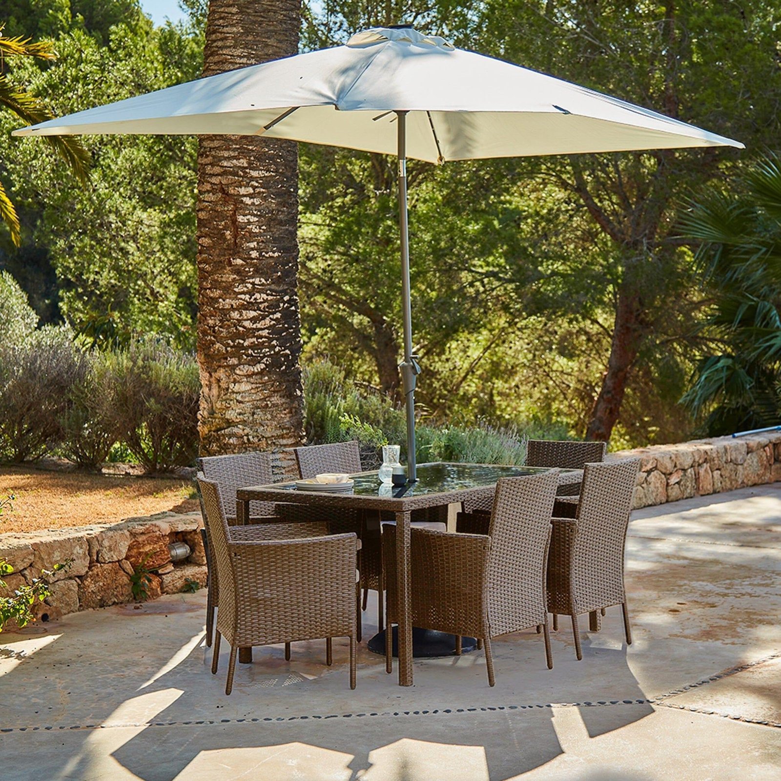 Revitalise your outdoor gatherings with the Marston 6-seater rattan dining set in Natural Brown. Made for six, it establishes an ideal setting for engaging conversations and delightful meals. Enrich your outdoor dining experience with the addition of a cream premium cantilever parasol, guaranteeing shaded comfort on sunny days. This set fosters a warm and inviting atmosphere, perfect for hosting gatherings infused with charm and sophistication.