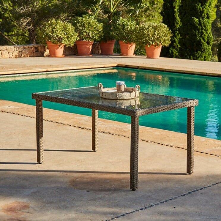 - Finish/Material – Natural brown PE Rattan with tempered glass tabletop.