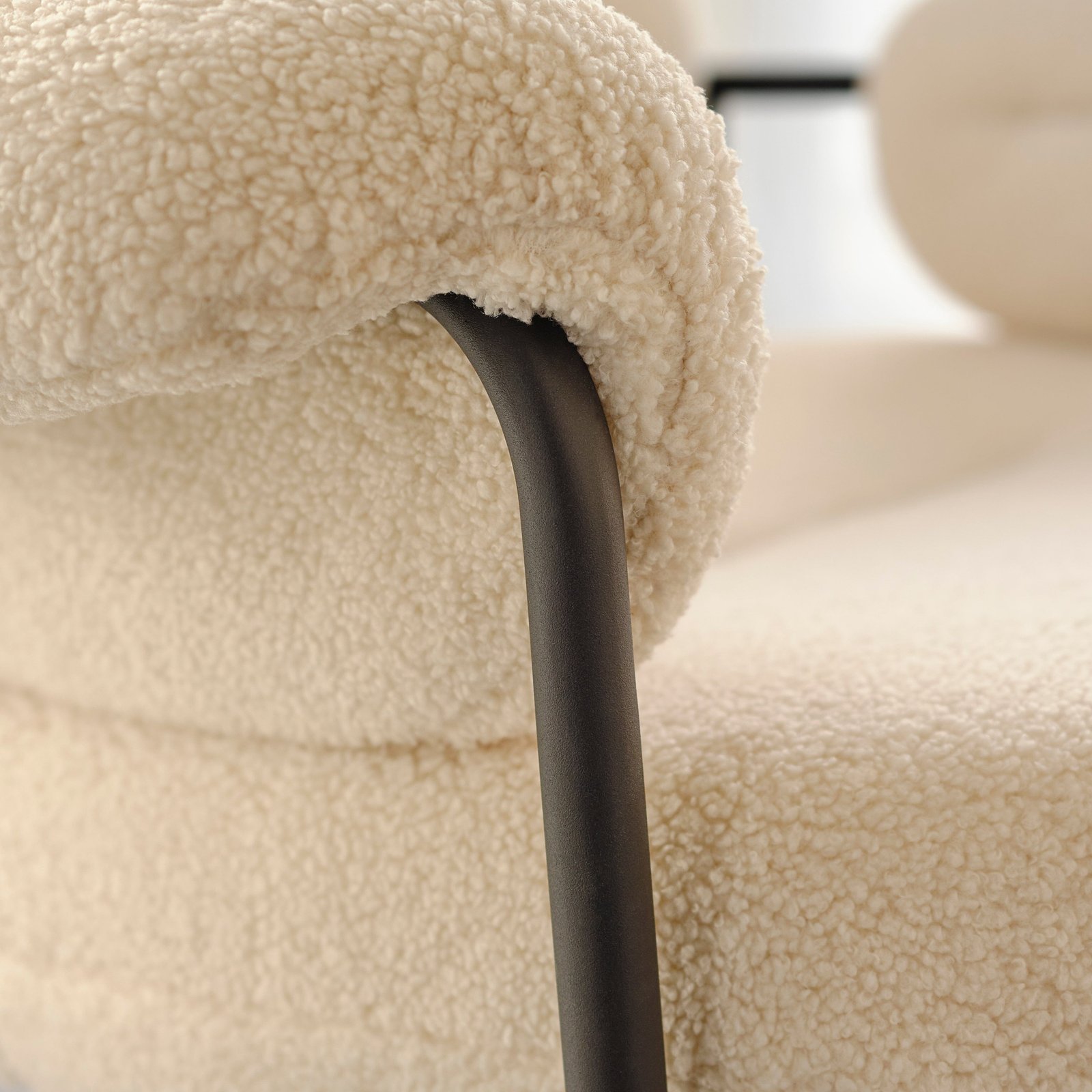 Mateo’s teddy fabric offers a cosy and inviting seat with a delightful texture, complemented by the sleek metal frame. Together, they create an armchair that exudes sophistication and high-end style. In cooler lights Mateo is a bright boucle and in warm sunset, turns to a snuggly neutral.