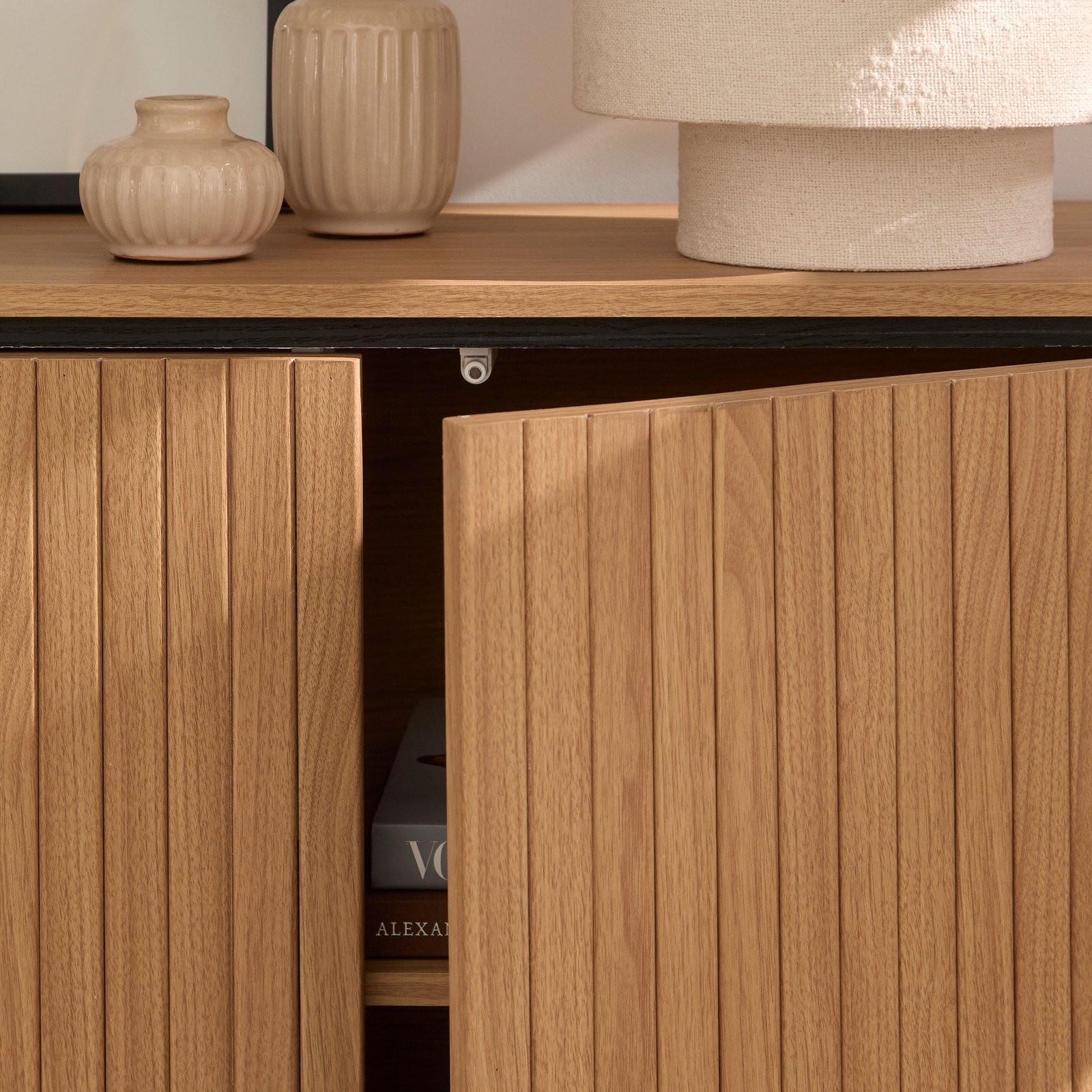 - Design features – Curved 2 door sideboard with textured slatted front doors and black raised legs.