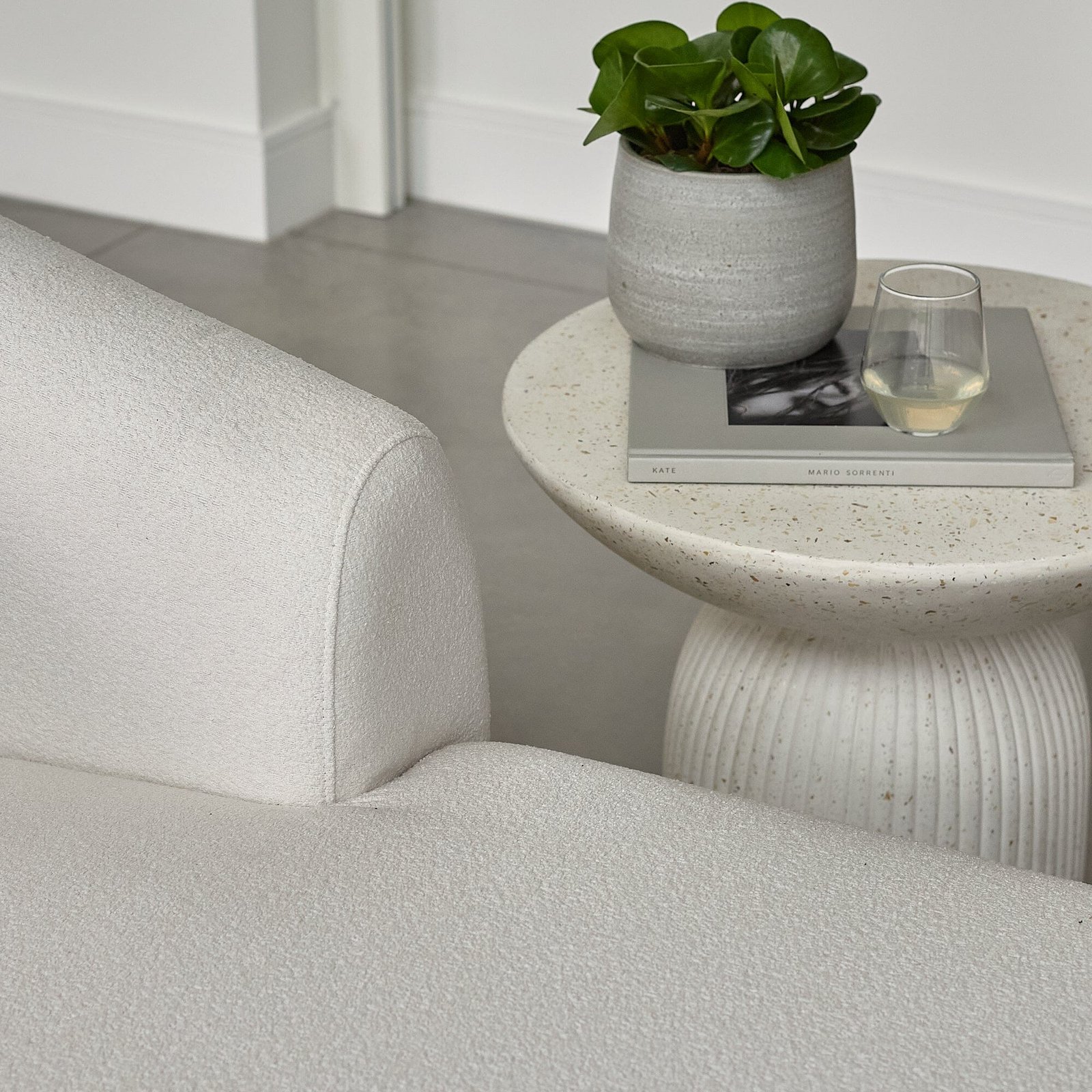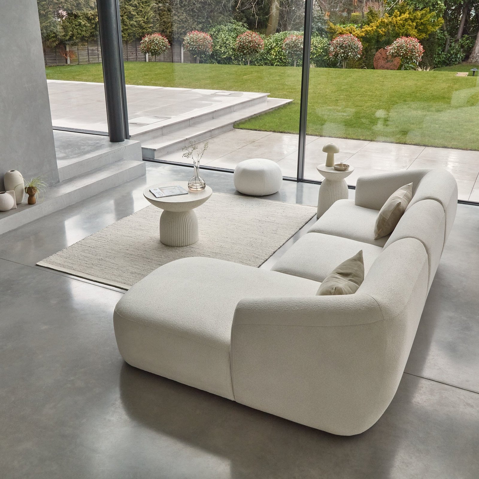 Nathalia Chaise Corner Sofa & Round Footstool Set – Chalk White Boucle