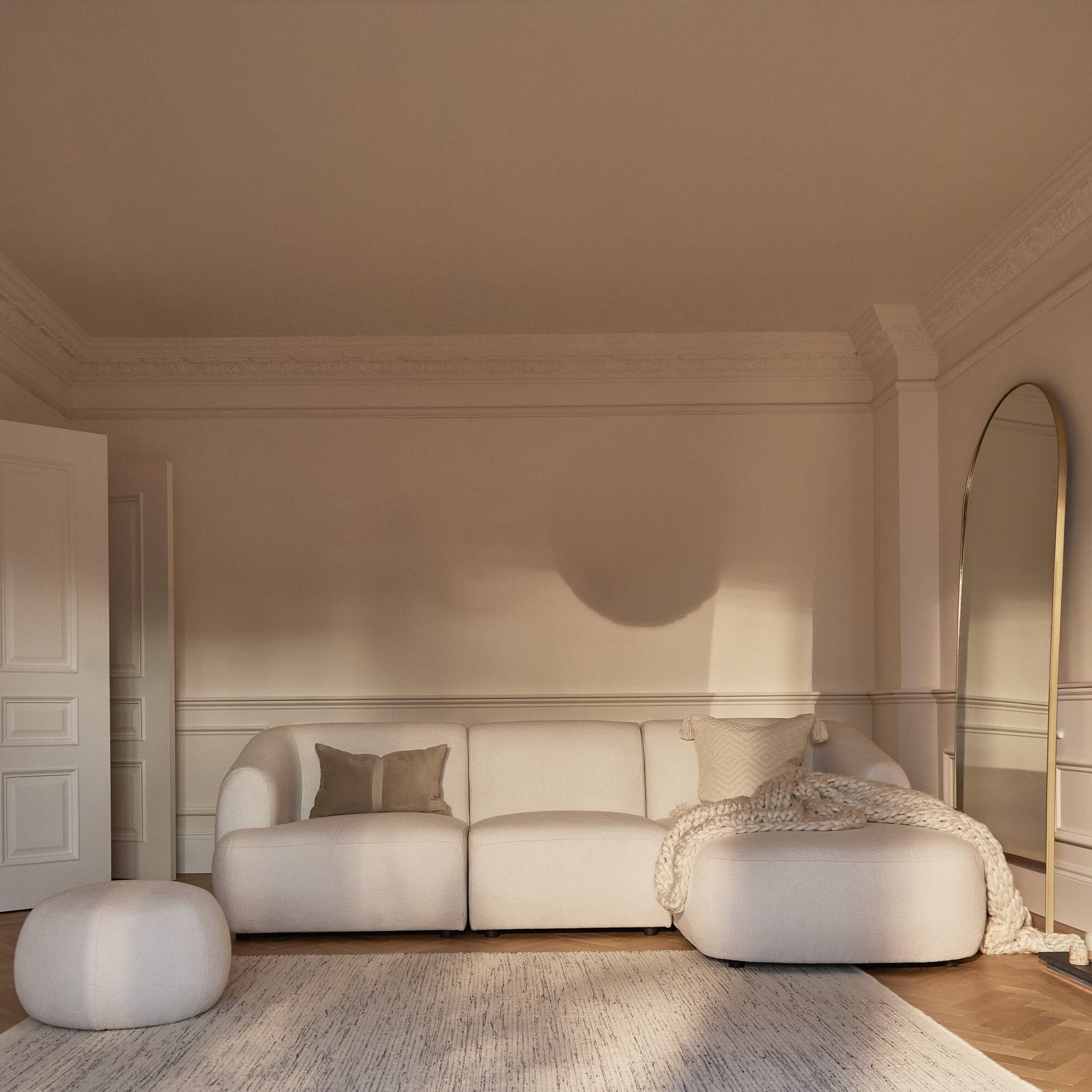 The Nathalia corner sofa and footstool set is crafted from boucle in chalk white. This 3-seater sofa features a modern curved edge and back design, ensuring elegance from every angle. Nathalia’s chunky arms and chaise design paired with the rounded, button like footstool, create a stylish sofa set made with exceptional comfort in mind.