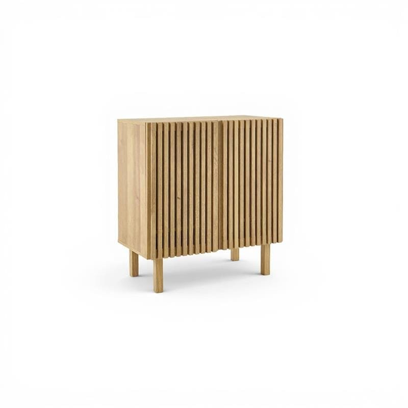 A simple way to elevate your interior space with stylish storage options. New for AW25 the Nia 2 door small sideboard with an oak effect finish features two slatted doors. Nia sits on raised legs for a contemporary feel. Ideal for a living room alcove, dining space or as a hallway cupboard, Nia is versatile and stylish piece for any home.