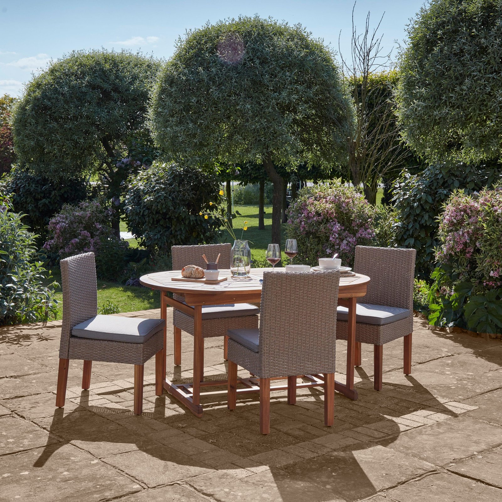 Oakley 4 Seater Wooden Extendable Round Garden Dining Table with 4 Rattan Dining Chairs