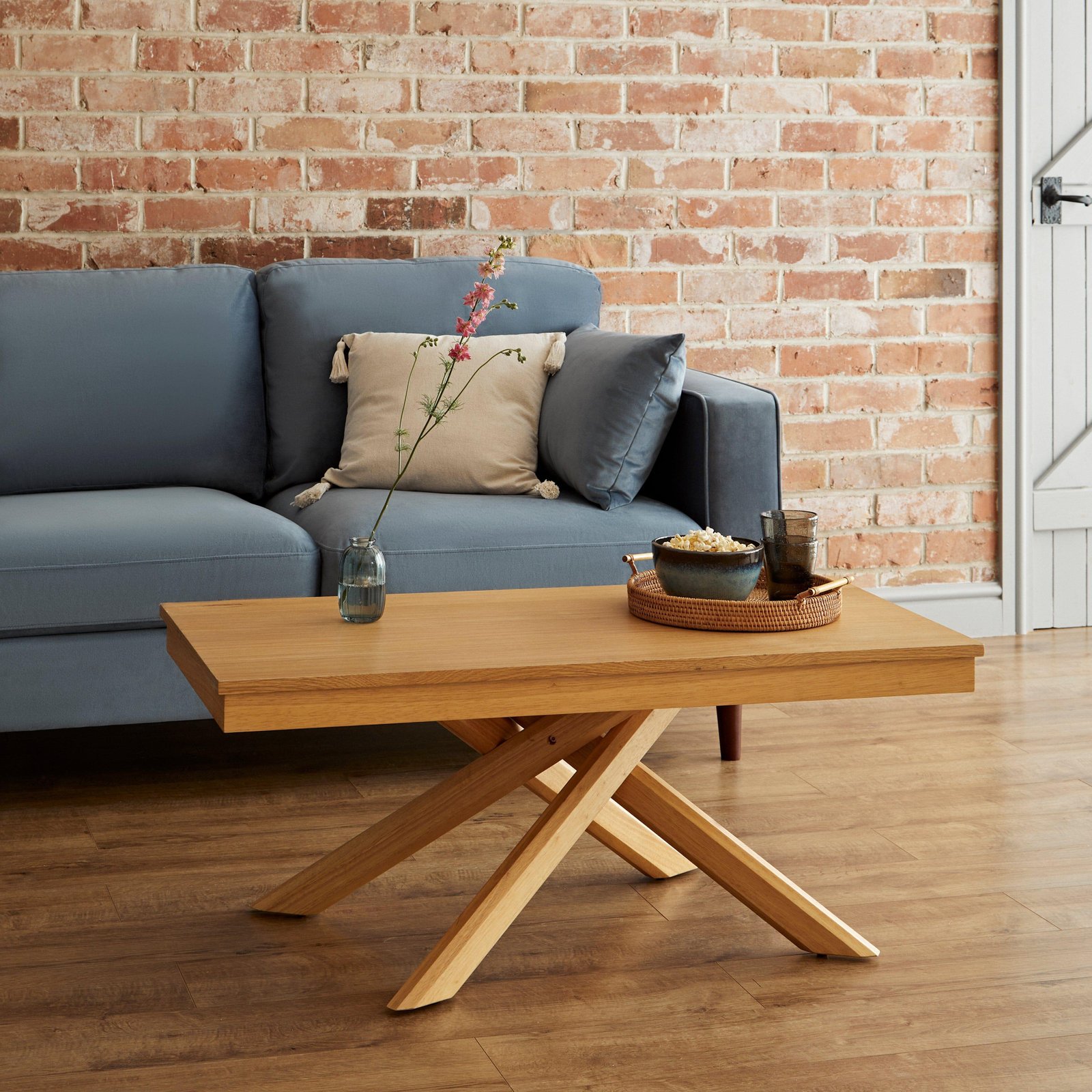 The Amelia coffee table is an oak coffee table and, just like the Amelia dining table, features an intricate leg structure.