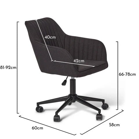 Get excited to work from home with our Anna dark grey fabric office chair. With thick cushioned seating and armrests, this swivel office chair will help make hours of work fly by as you sink into it comfortably. The simple silhouette and classic dark grey upholstery mean that whatever the colour scheme of the room, the Anna will match seamlessly.