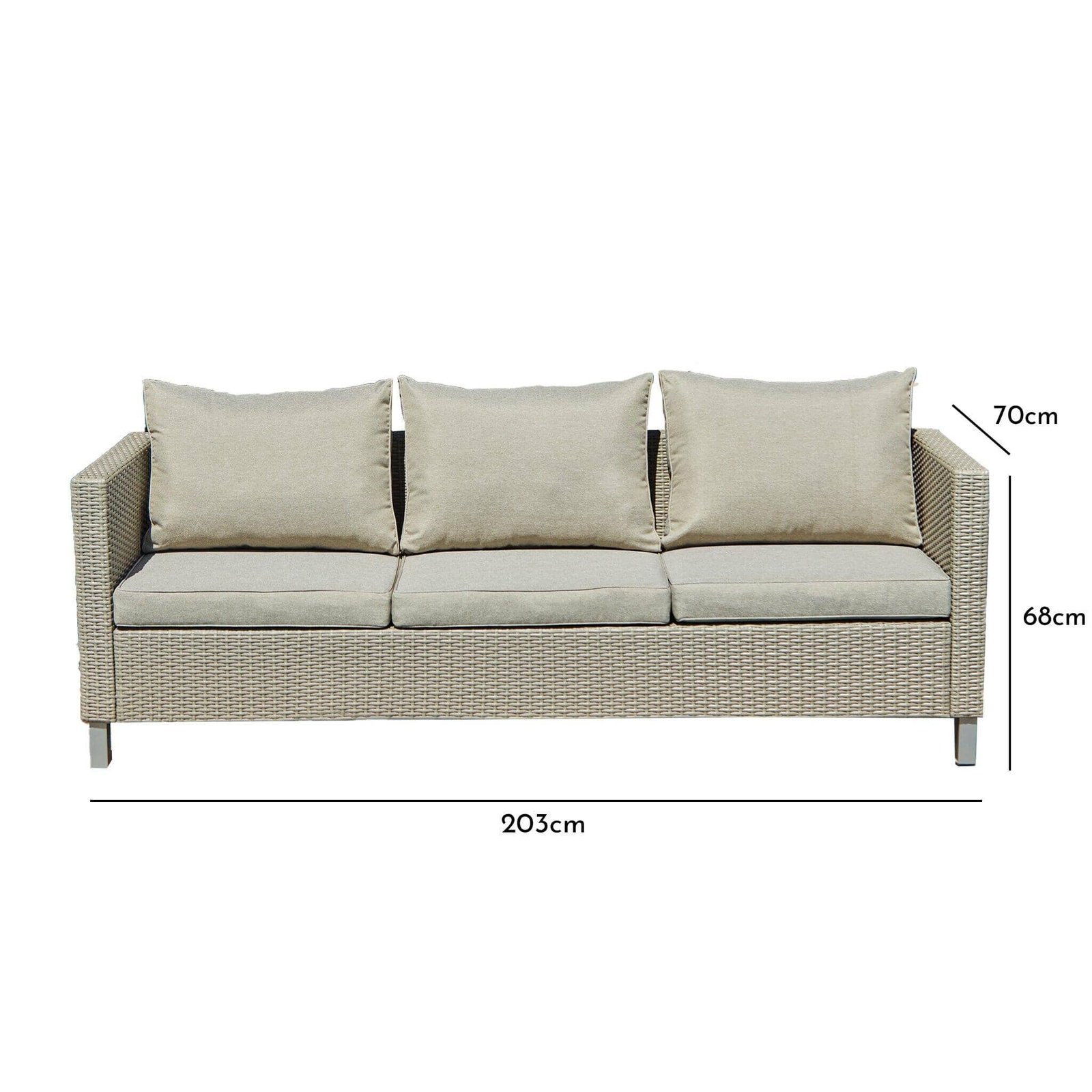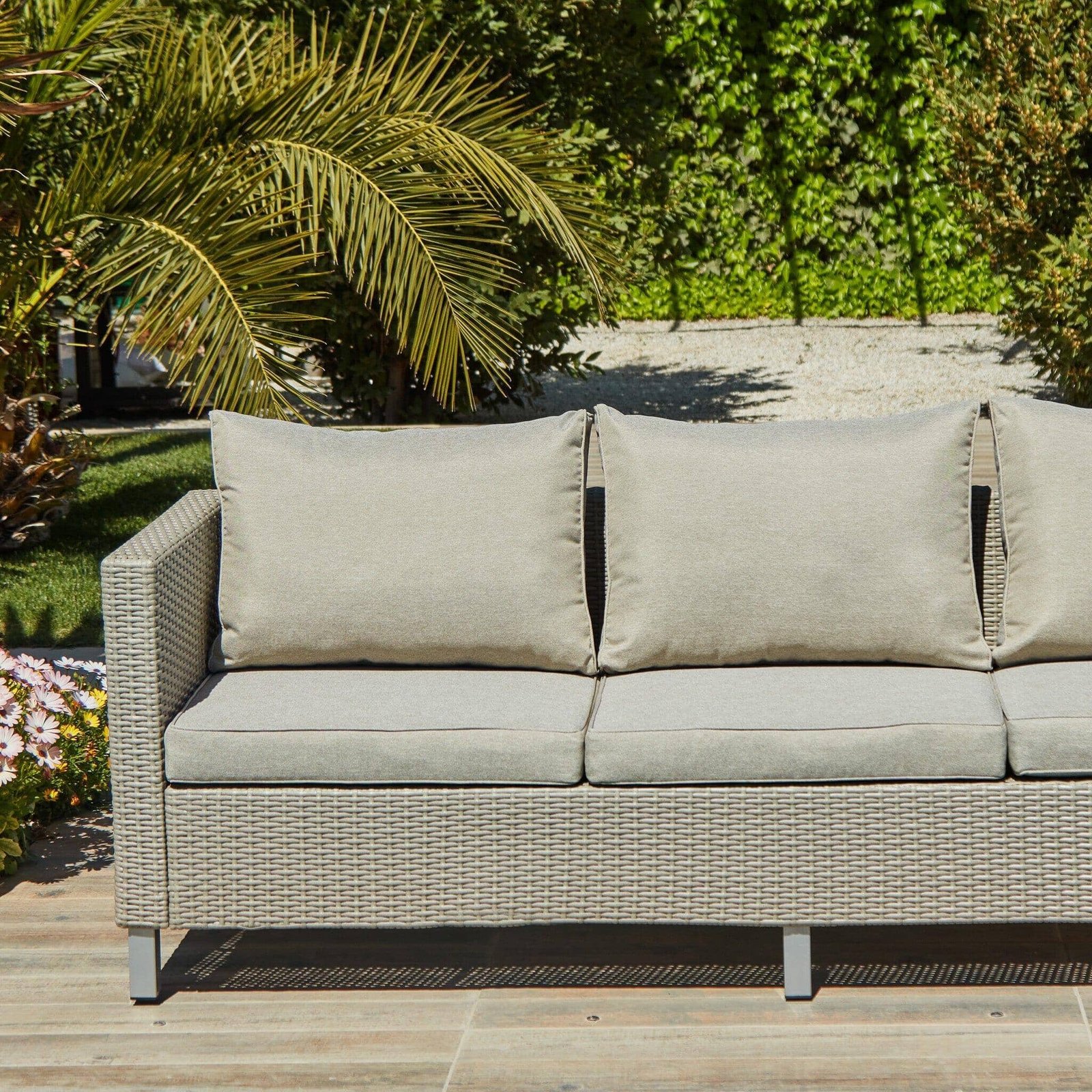 The sofa comes complete with three soft, plush cushions in a stylish grey colour, providing ample space for you and your loved ones to relax and unwind in comfort. Whether you’re watching a movie or hosting a garden party, the Aria 3-Seater Rattan Sofa is the perfect choice for your furniture collection.