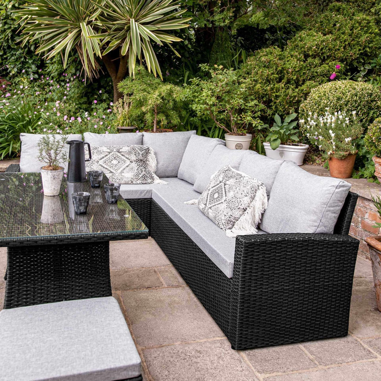 The Aston Rattan Corner Sofa & Dining Set is a wonderful option for casual diners. The corner sofa would comfortably seat 6 but with the addition of 3 footstools which double up as extra seating, this set can seat up to 9 people making it ideal for al fresco dinner parties with friends and family.