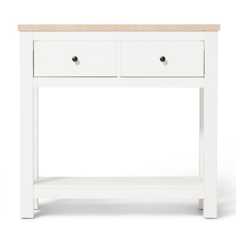 This console table features an oak effect countertop and a modern alabaster white painted frame, perfect for pairing with modern country decor to create a stylish atmosphere. Complete with antique brass handles this storage table gives a contemporary feel to a classic design.