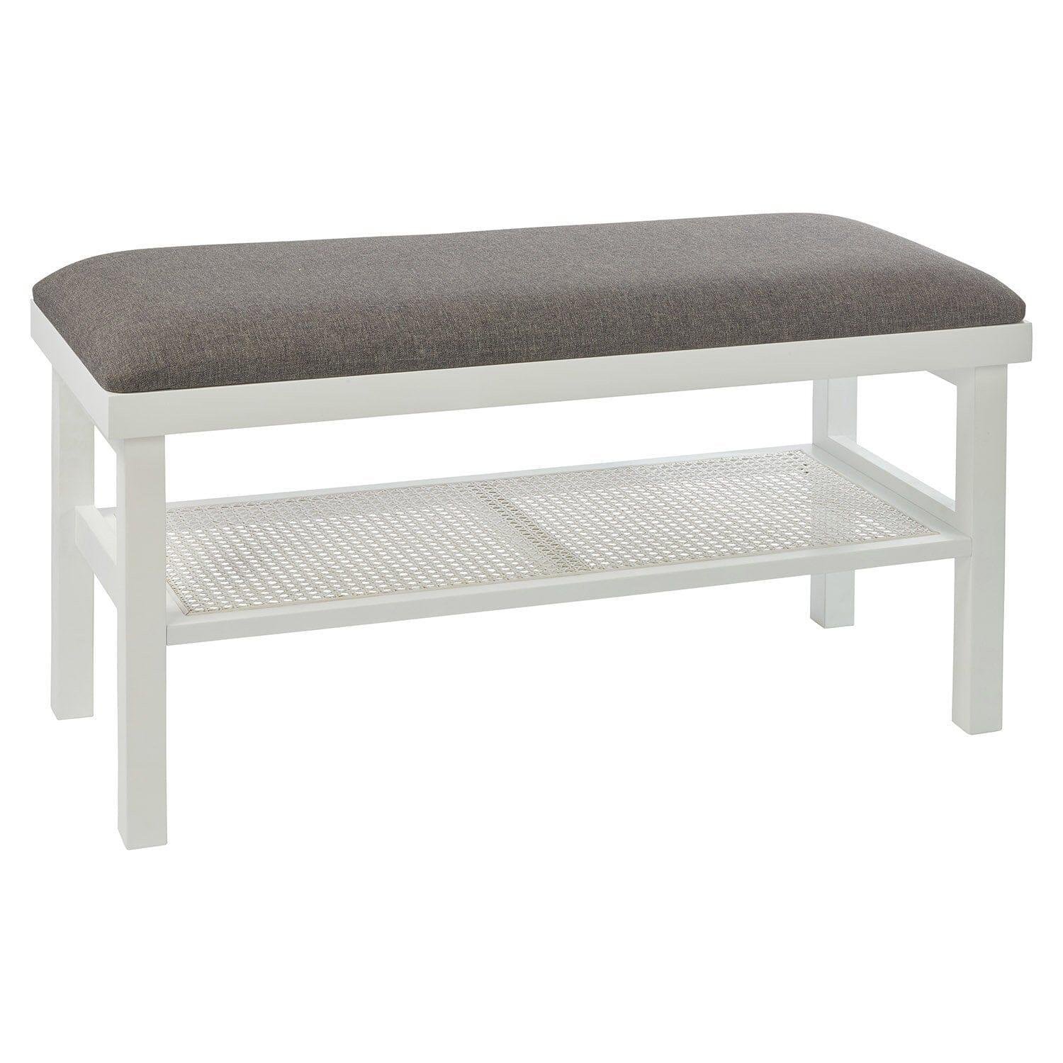 This hallway bench also features a lower shelf in a beautiful white painted woven cane finish, which is a perfect place to store away shoes.